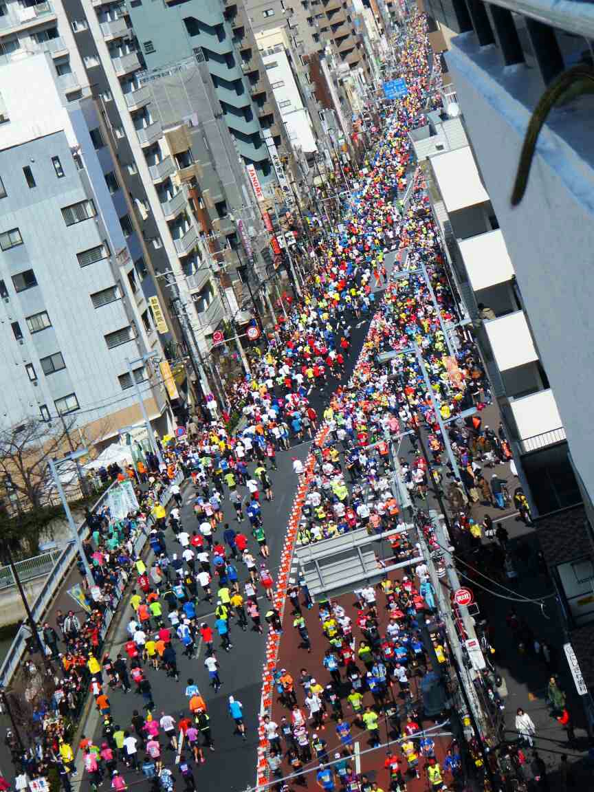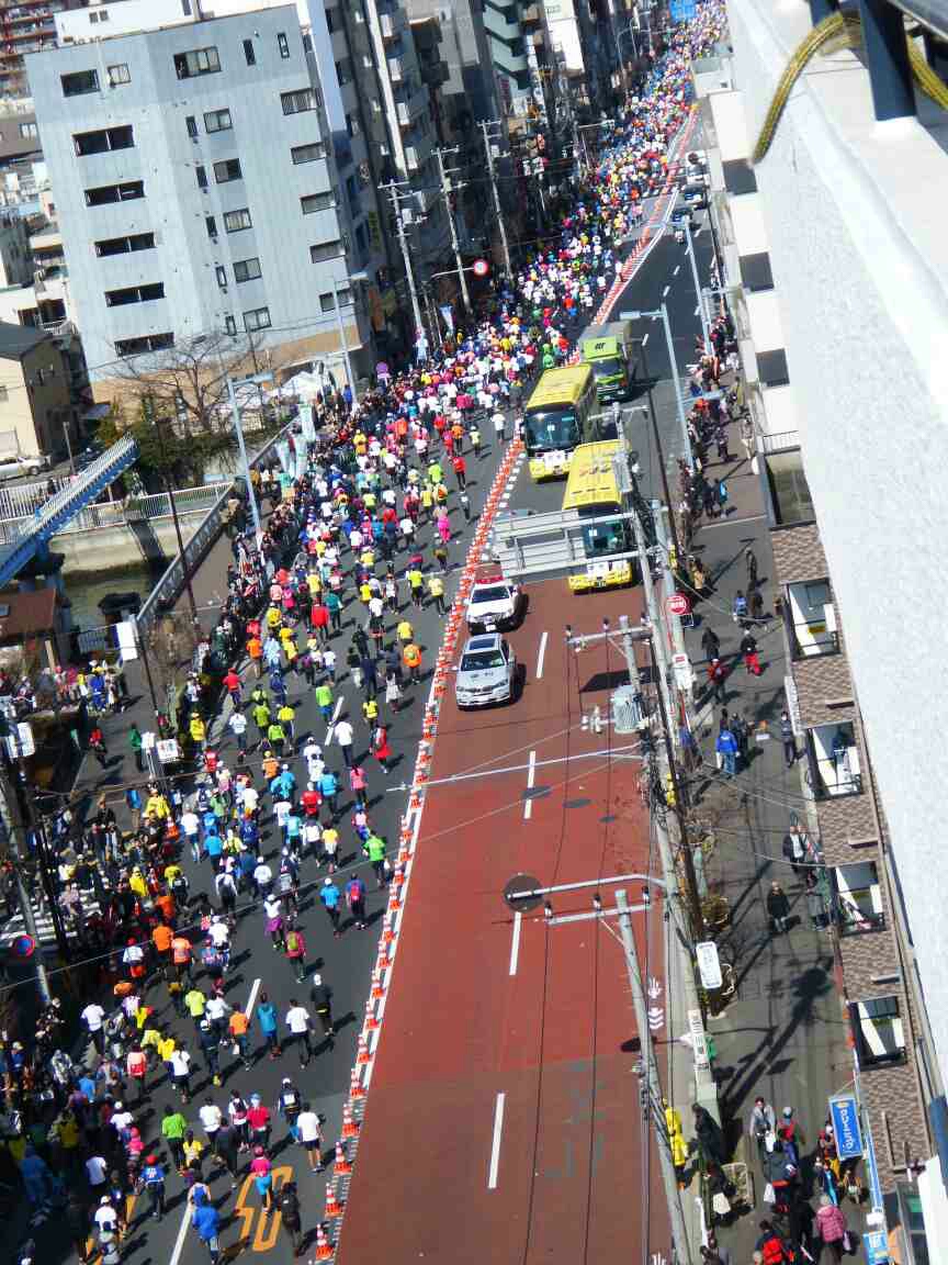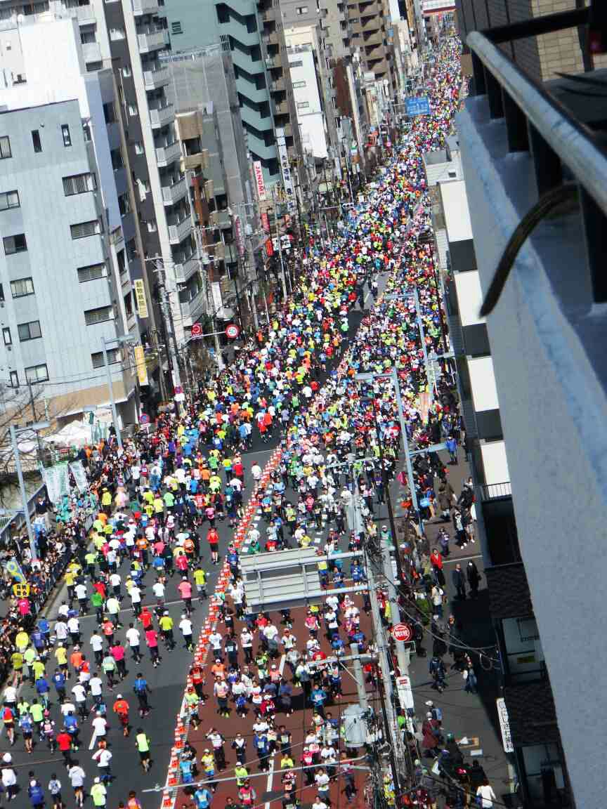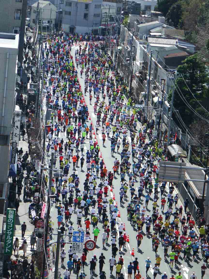洗顔を済ませ朝食のさなか、外の声援が更に大きくなったので覗いて見ると、一般市民ランナーの大群が押し寄せて来た!