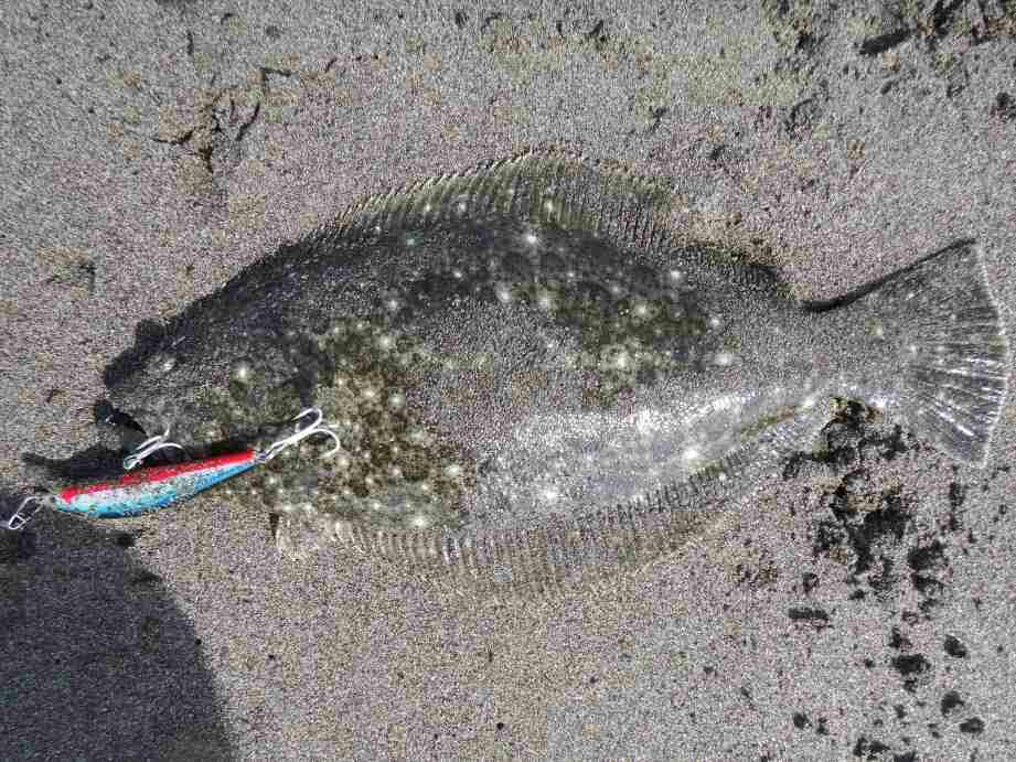 隣の同業者にルアーを回収して頂きファイト続行、何とかヅリ上げると、ヒラメの鰓蓋付近と胸鰭にフックが掛かっていました。