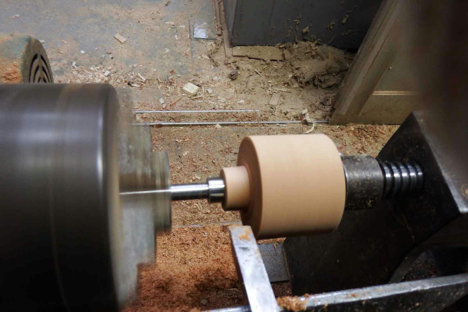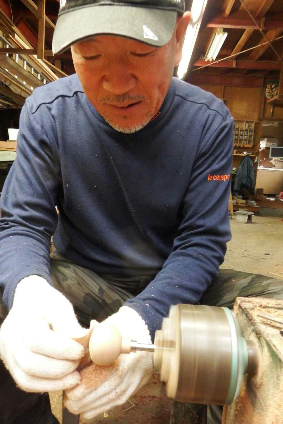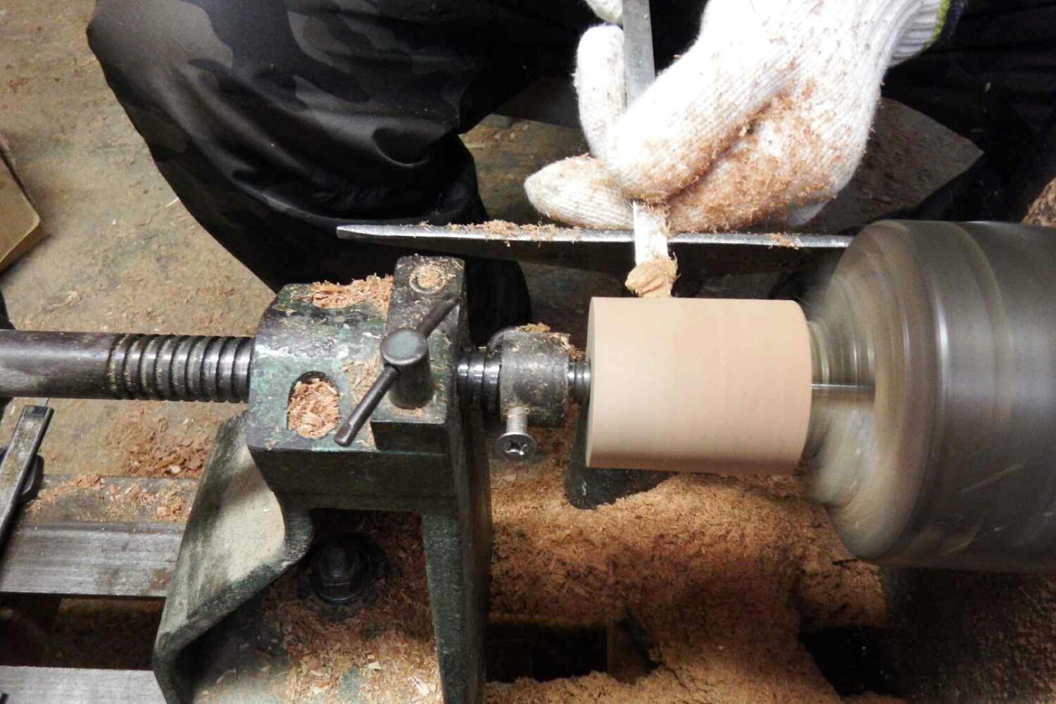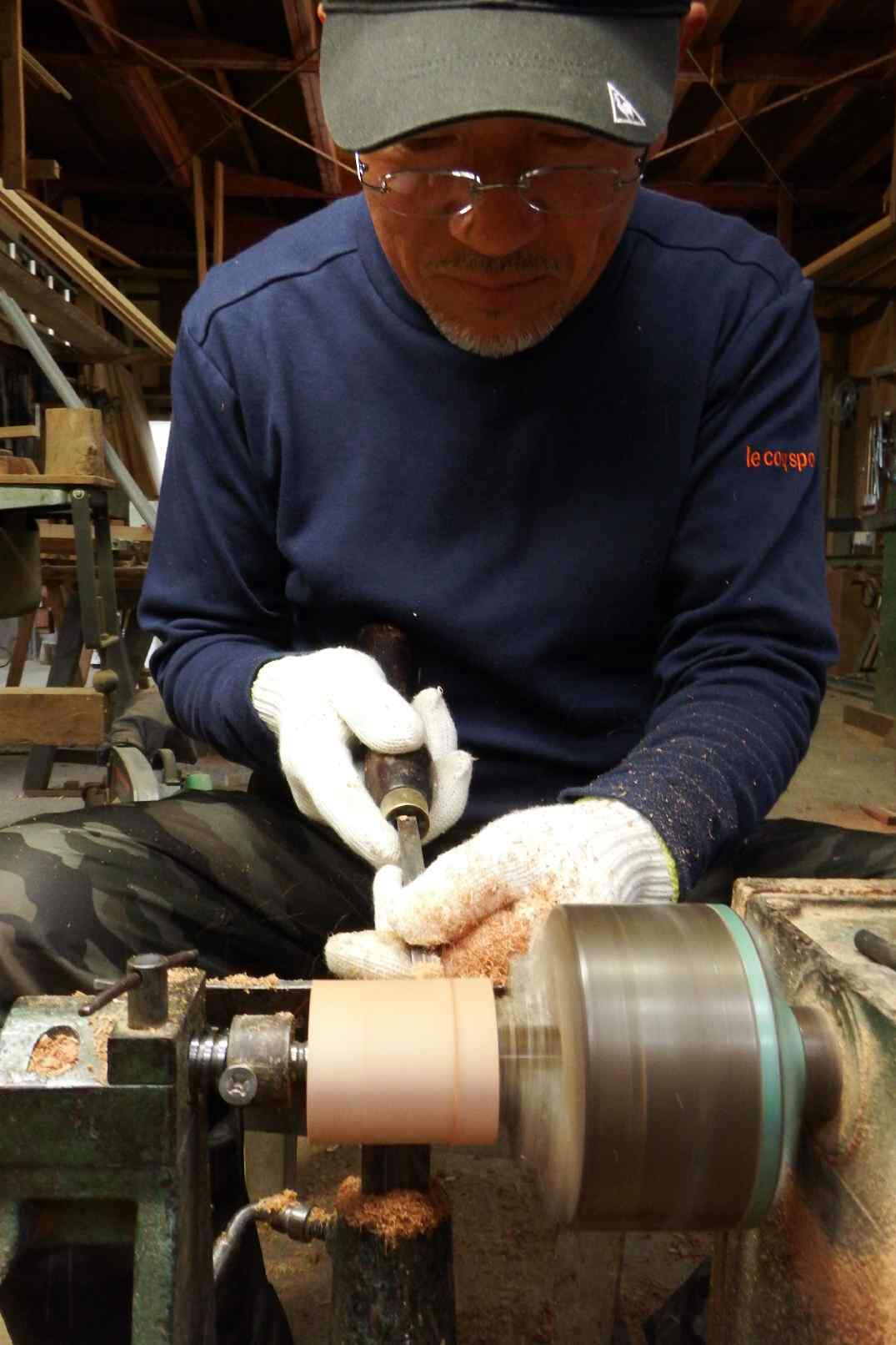 木工旋盤を回し、バイト(ノミのような道具)で円筒になるまで削る。