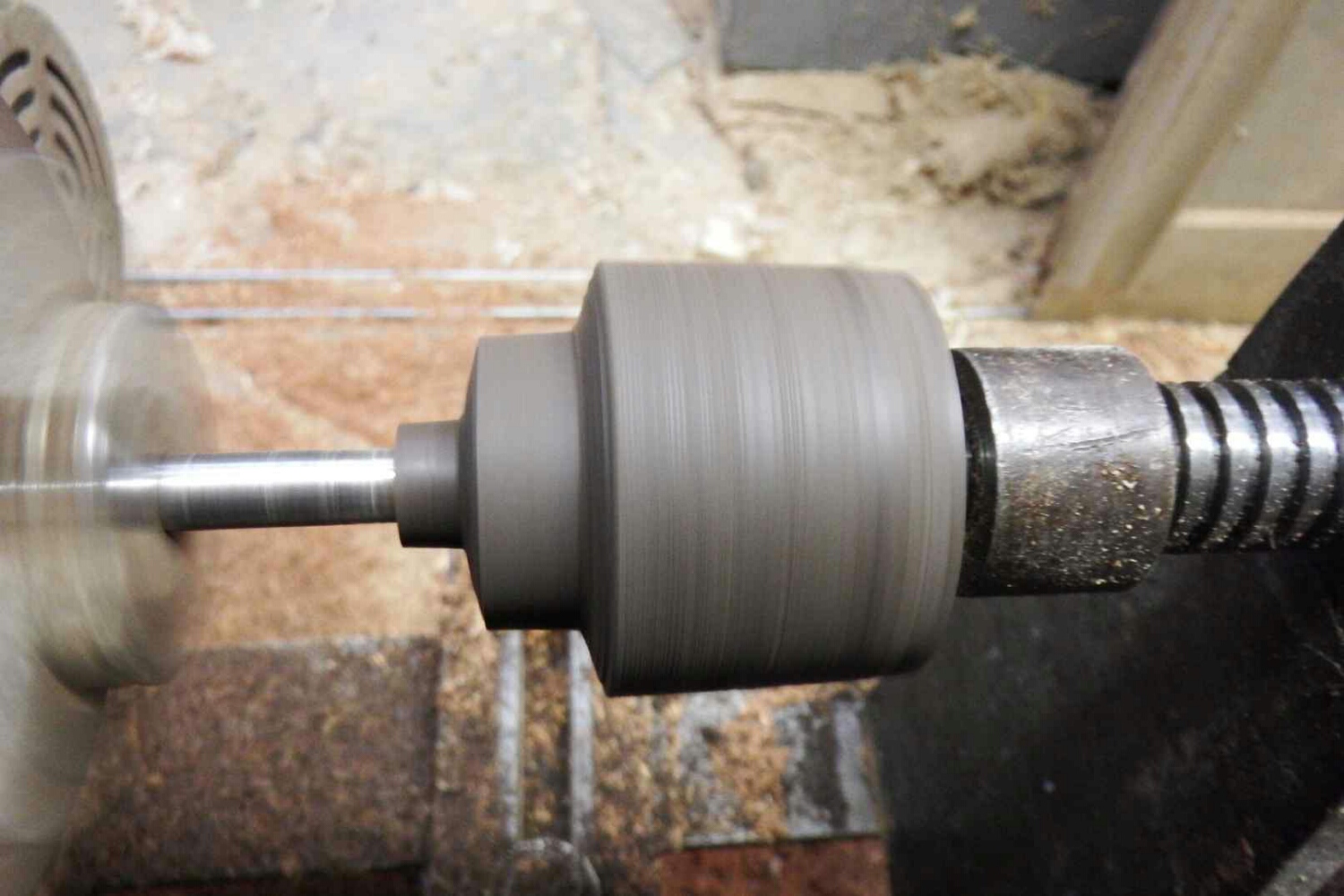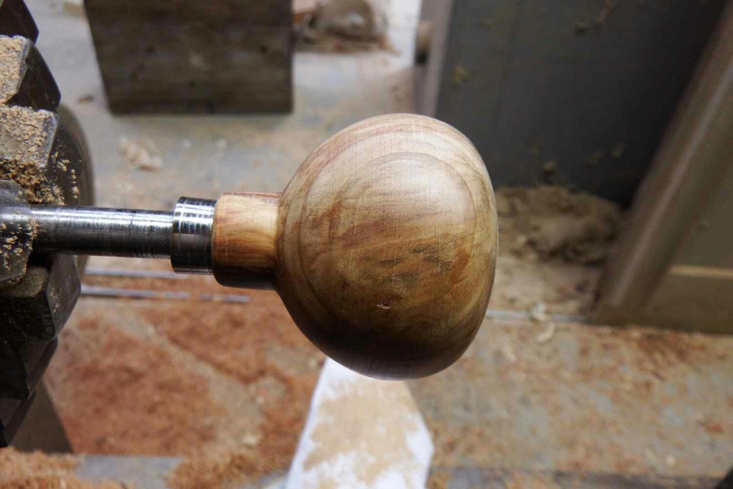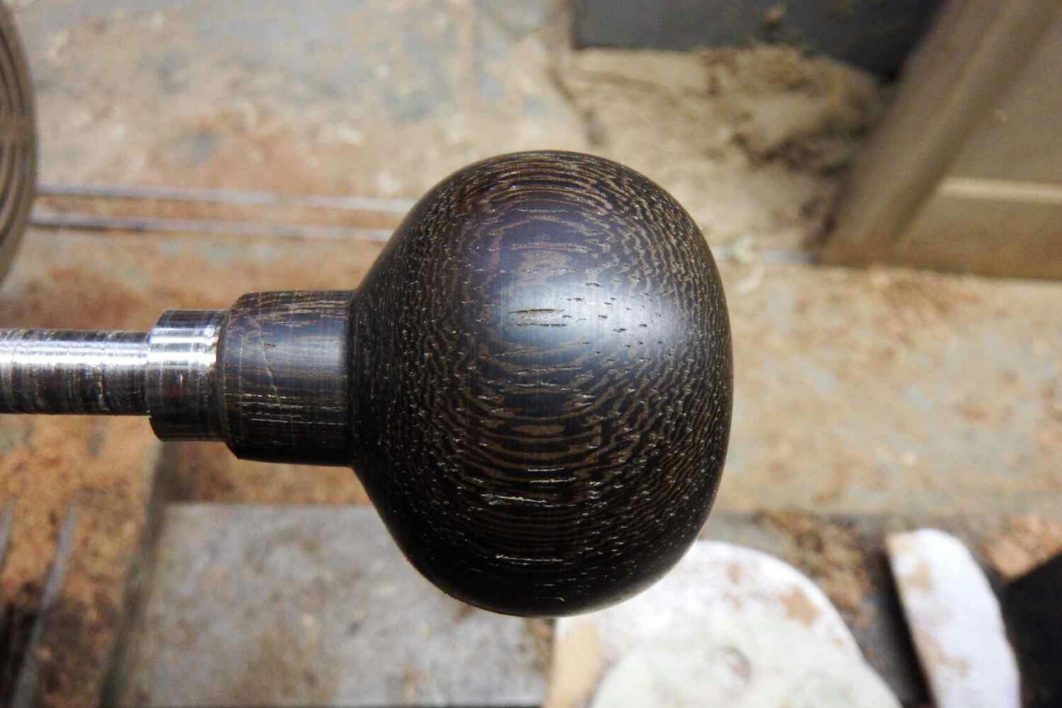 円筒になったら、ハンドルに差し込む所を最初に削り、破損防止に金具を先にはめ、徐々にバイトでノブの形に削っていく。