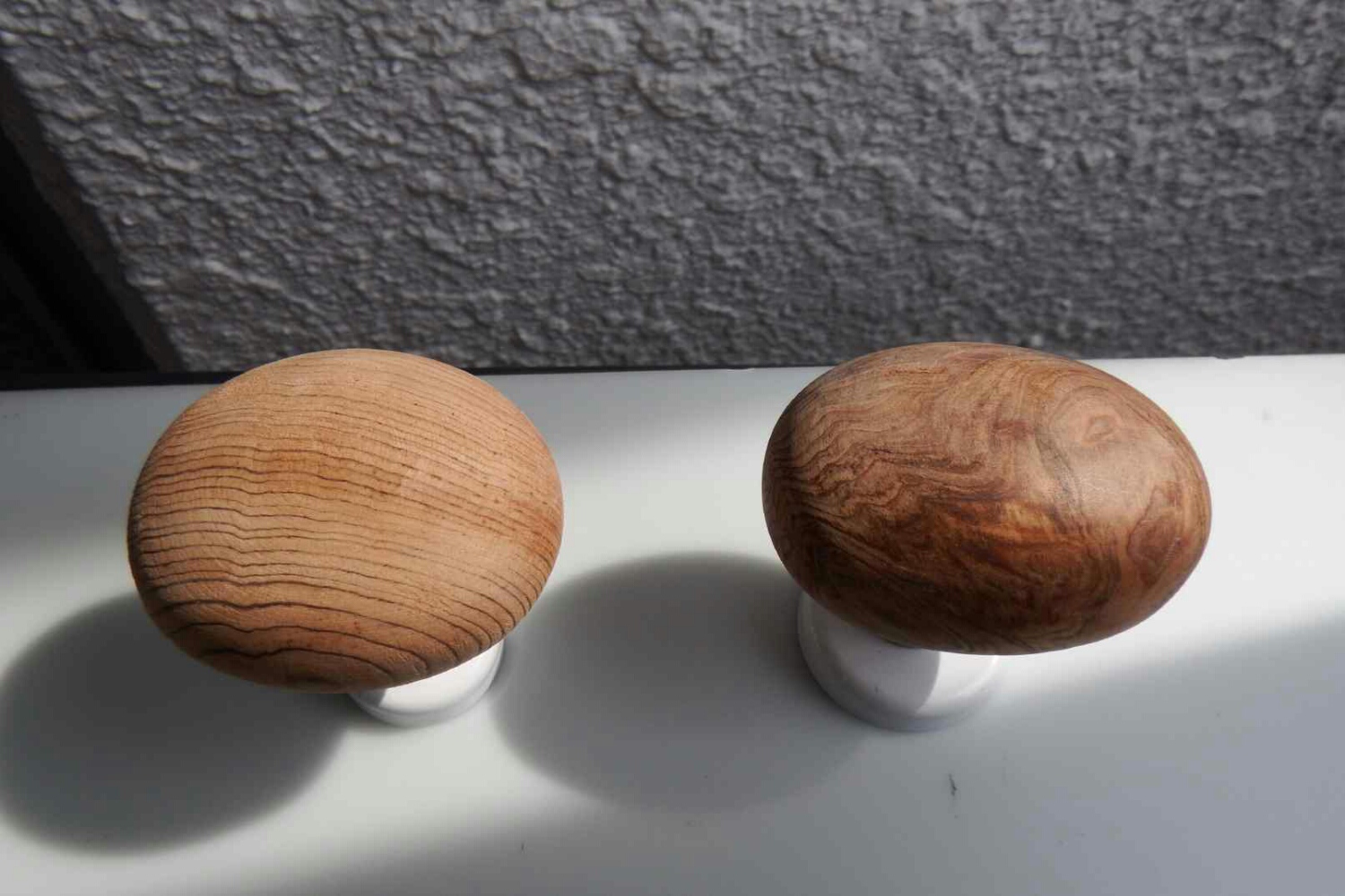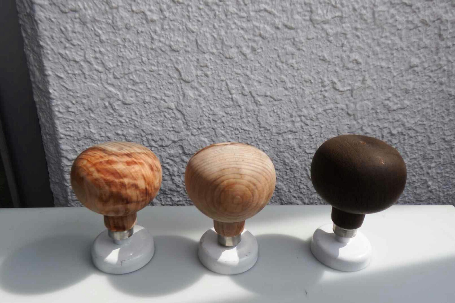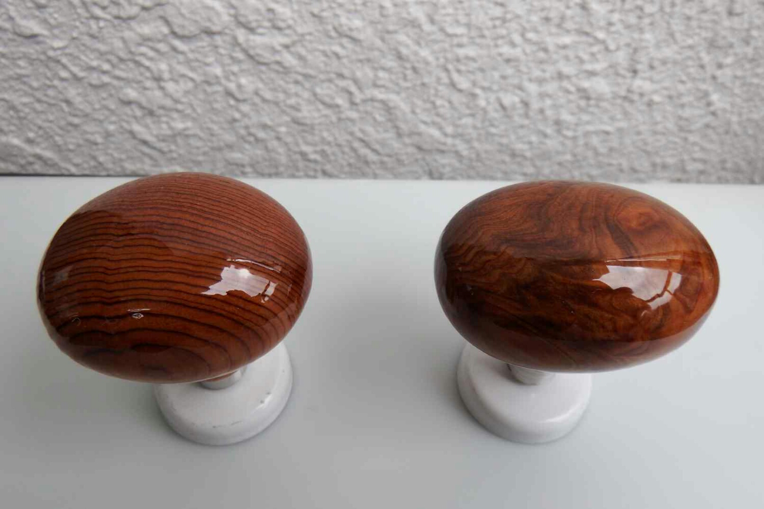 4個全て同じ日光杉ですが、コブの部分で出来たノブは、角度を変える度、光の屈折でオパールの様に色合いが変わります。