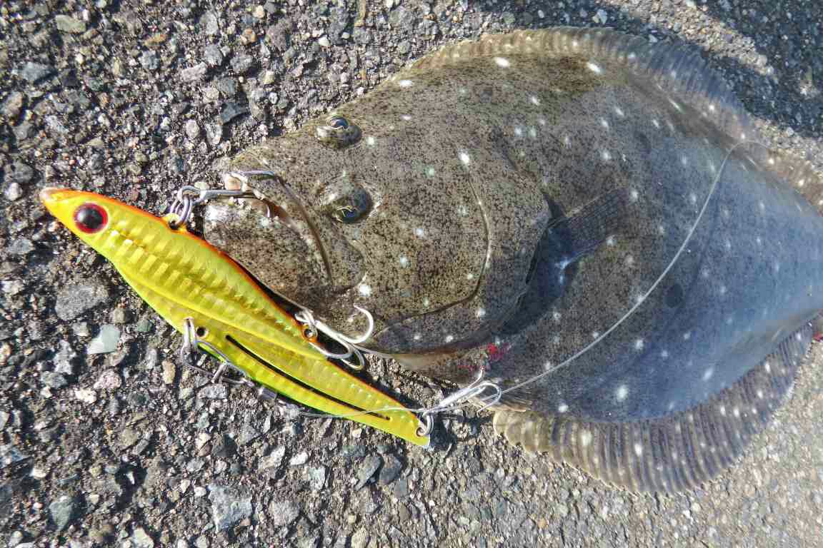 間も無く、ヒラメらしきバイトが有り、合わせを入れると確かなヒラメの手応え。