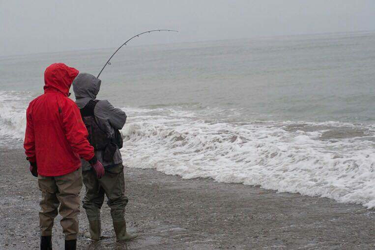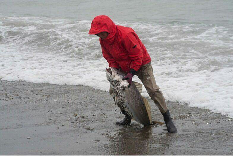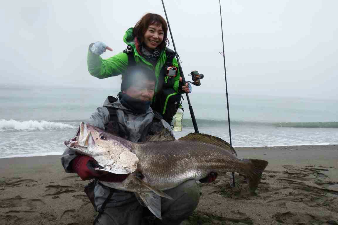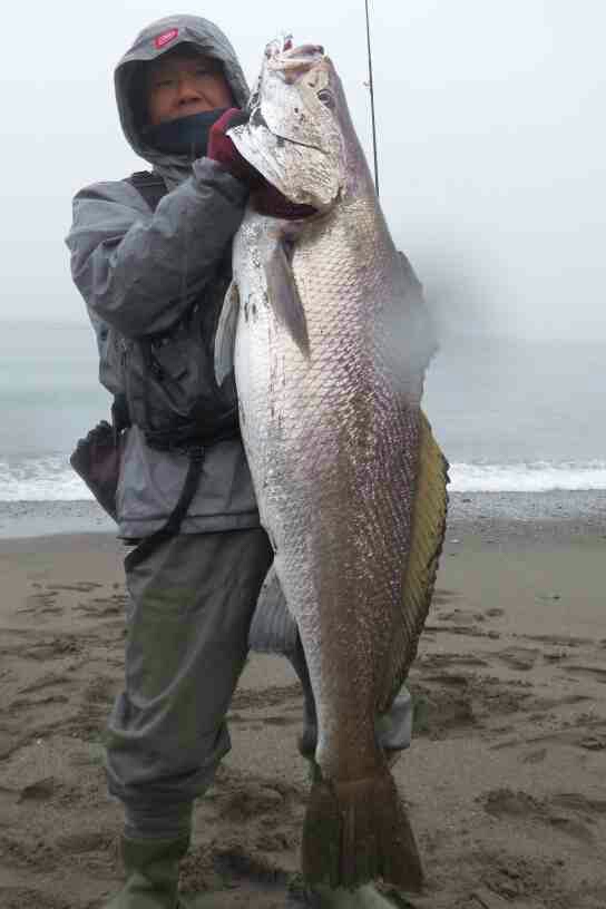 “奴”の重さと引き波の抵抗を凌ぎ、波が引いた時点で鰓蓋を抉じ開け手を突っ込み、そのまま砂浜に引きずり上げる。