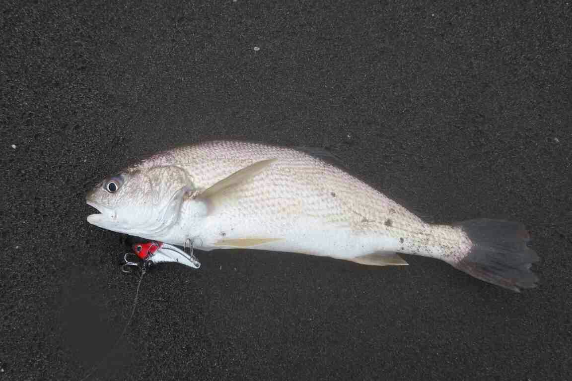 団子方向にキャストすると、掛かってくるのは10cmほどのグチだが、オオニベは付いていない様子。