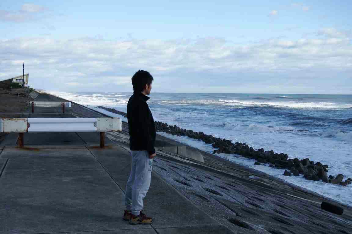 石崎浜の水色は比較的良いが波は荒い、全体を見渡すと見慣れたシルエット!岩永君はこのサーフに入っていました。