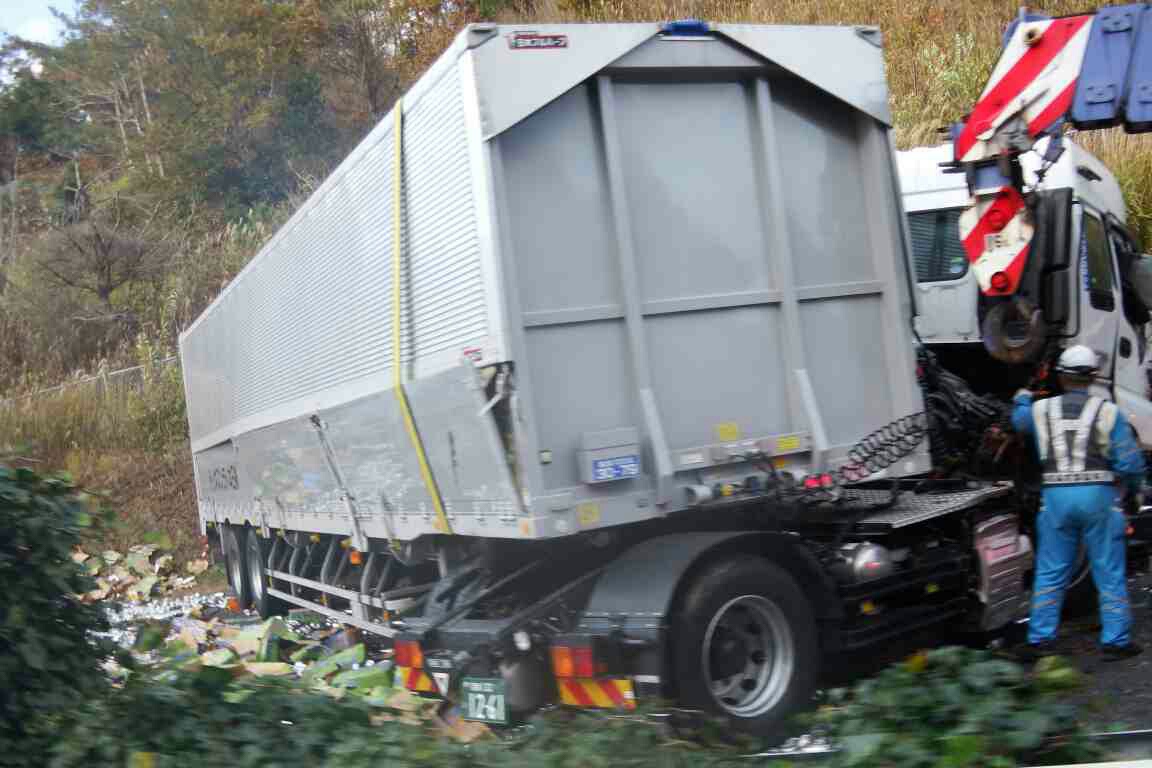 大型トレーラーは、数字の7のような状態で道路を完全封鎖している。