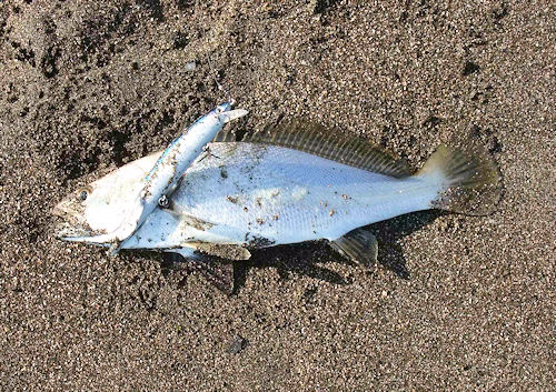 ヒラメかもと思いながら上げると、ニベのスレ掛りでした。二人ともそれを見てガックリ。