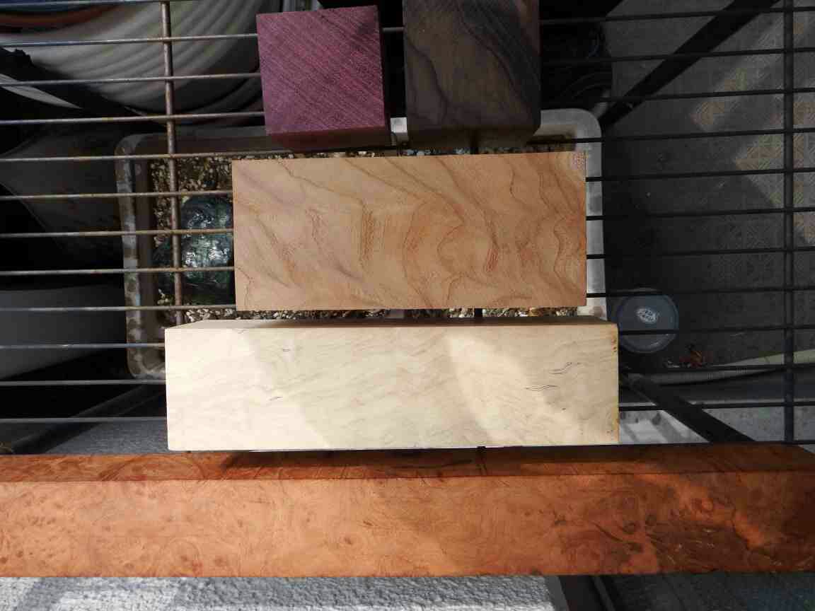 上段の左はパープルハートの木の柾目、右は黒檀の木の柾目