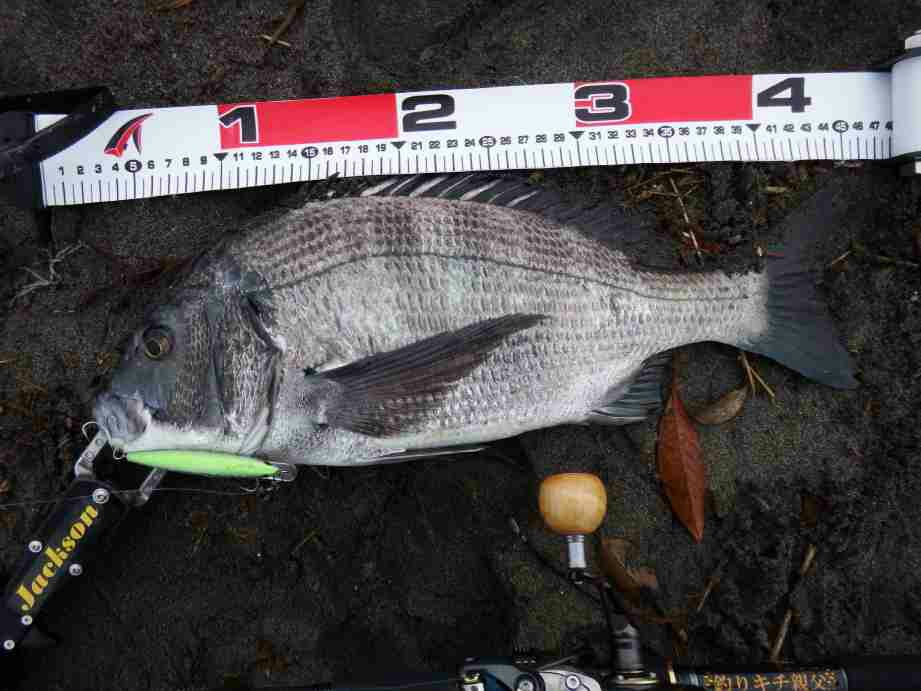 データー:05:10ゲット、黒鯛体長45cm、ジャクソン ビンテールチューン27 レモンキャンディー