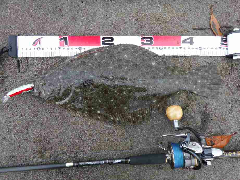 データー:07:40ゲット、ヒラメ体長50cm、ジャクソン ビンテールチューン27 アカハライワシ