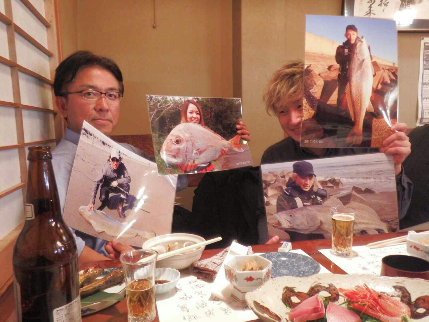 井戸川さんとサキちゃんの写真(A3サイズ)を塚ちゃんに託し、山中君には今年1月3.4日に釣ったオオニベ写真を渡す。