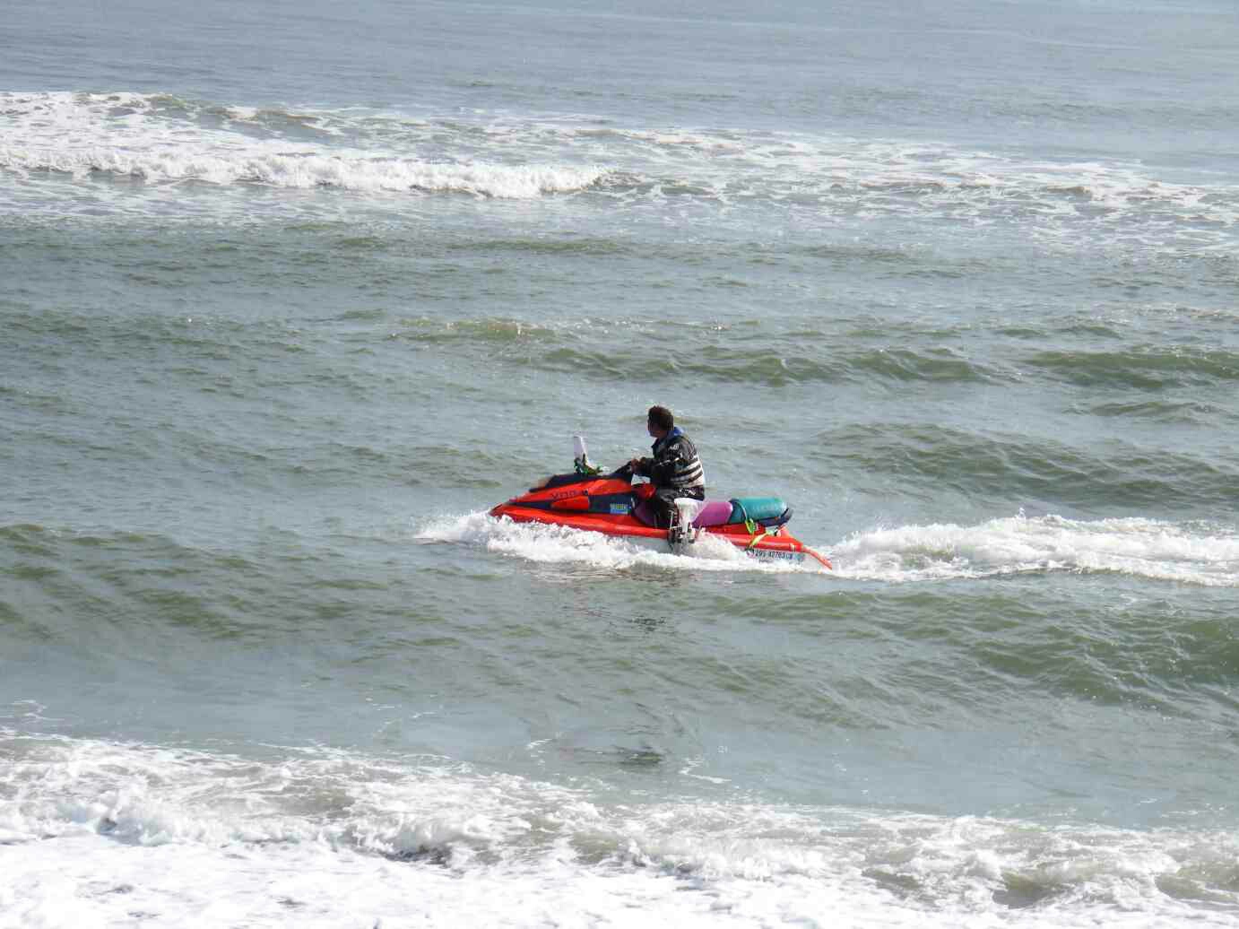 ジェットスキーを観察していると、運転席左側に魚群探知機を付け水深を測っているようだ。