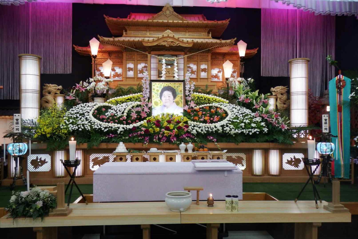 神式、祭壇の中央に注連縄が張られ、神社から神主さん三人が来て葬儀を執り行い、弔問客は数珠は持たず榊を献花し、弐拝礼、弐拍(50日経過するまで音は立てない事)、壱拝礼する。