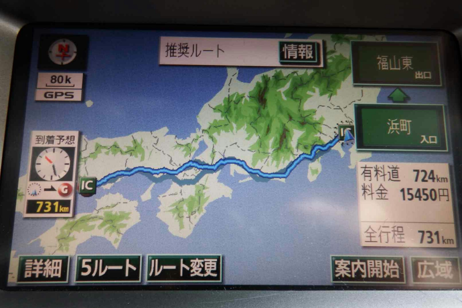 福山東出口までの高速道走行距離は724kmで、ホテルまで約5km、トイレタイム休憩等を取らずに走り続けた場合、カーナビ計算では9時間20分、全行程の約半分を走った事になります。