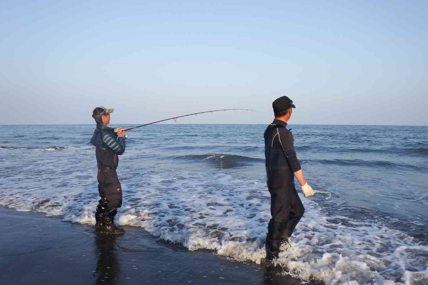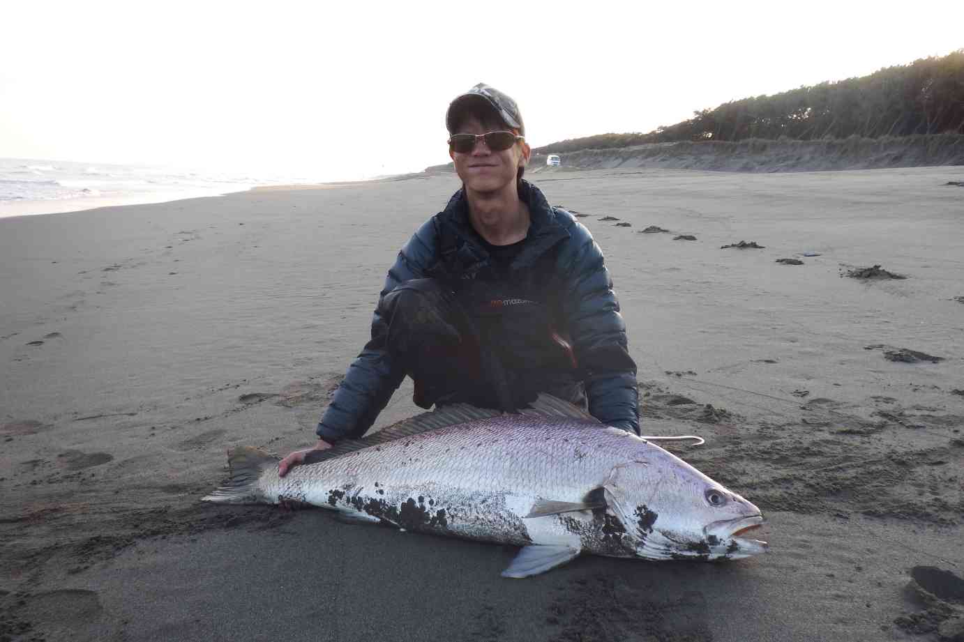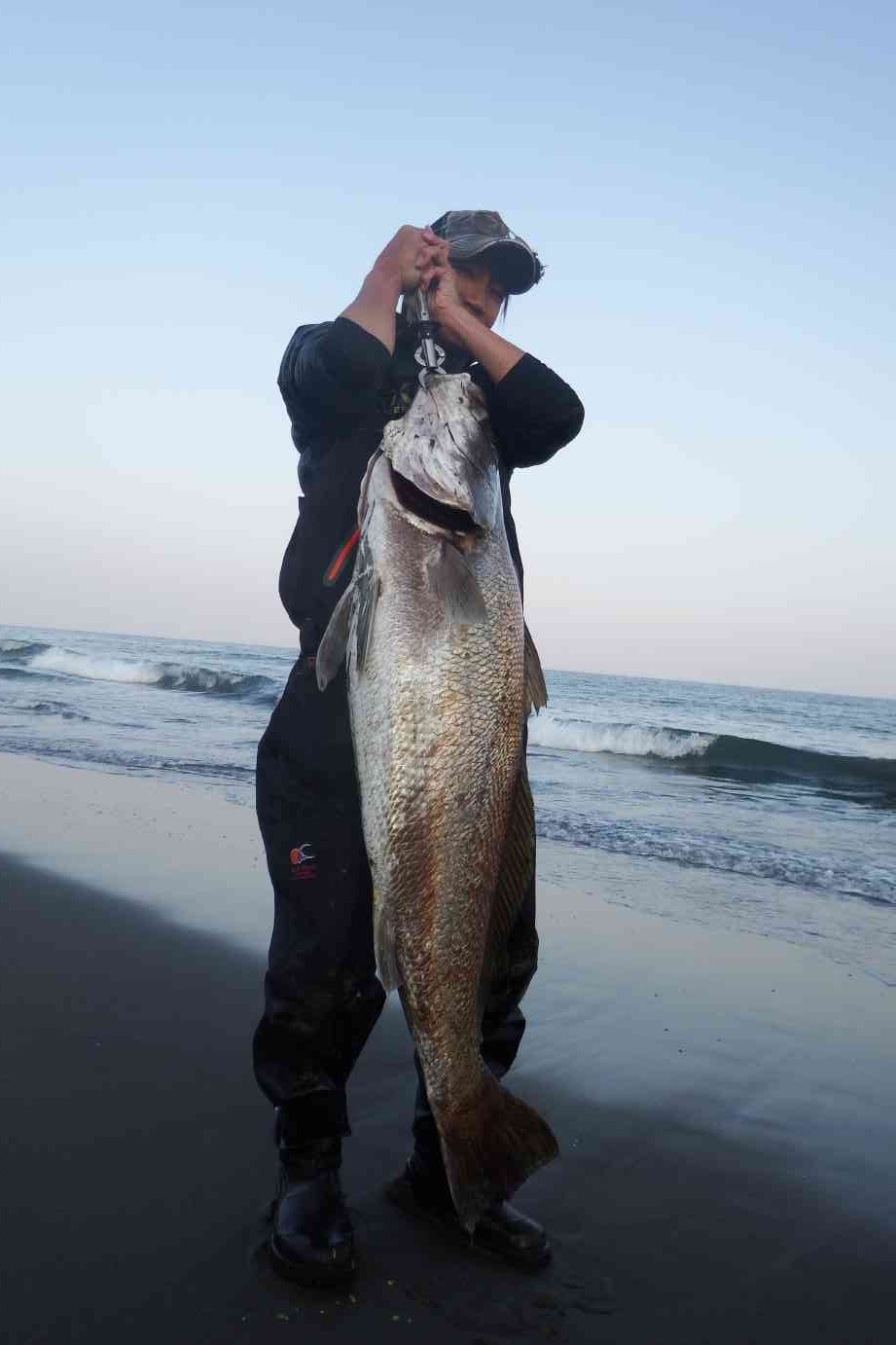「まさか」と思いながら駆け寄ると、師匠がオオニベをゲットし砂浜に埋めてあった。