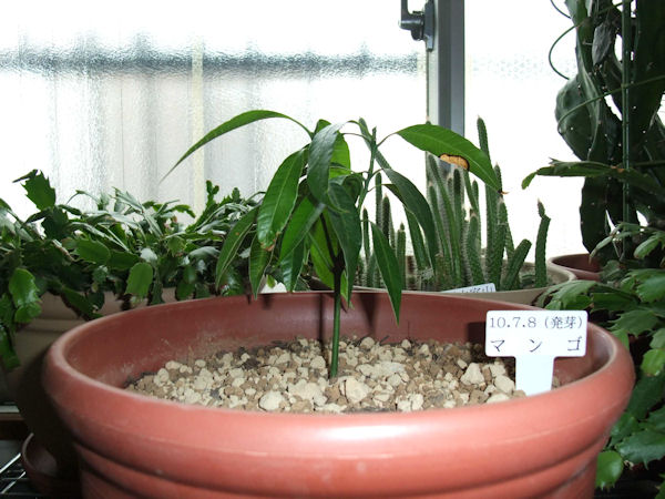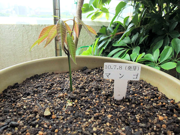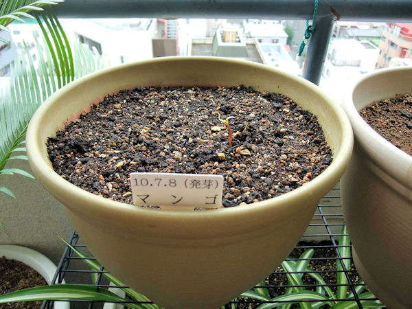 朝ベランダに出たら、弱々しいモヤシのような芽が出ている、紛れも無いマンゴの発芽です。