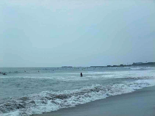 (波が無いのに辛抱強く波待ちするサーファー)