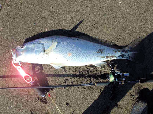 「俺がオオニベならあのポイントでベイトを捕食する」と思い、キャストすること2投目でヒット。