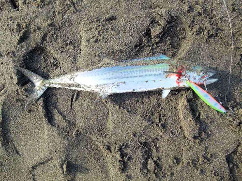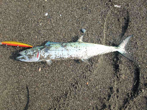 強烈なファーストランと思った直後、物足りない引きに変わりサーフに引き上げるとサゴシでした。