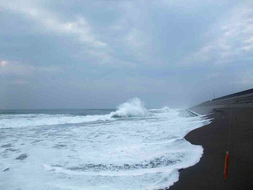 06:00、防潮堤の上から見た海は波が治まったかのように見えたが、
