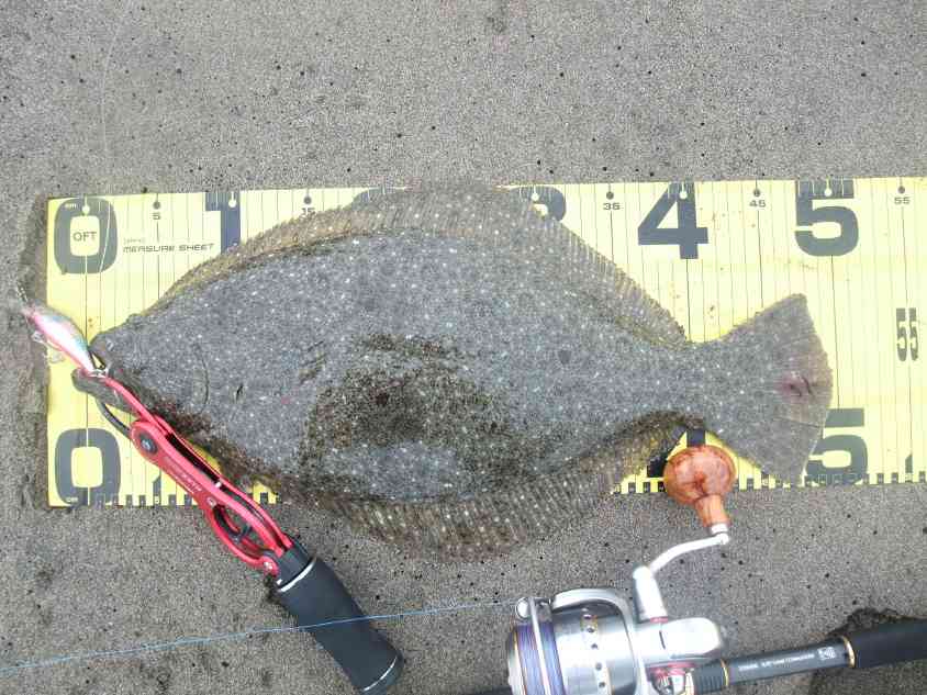 会話を交わしながらキャストしていると、左のSさんが50cmオーバーのヒラメをゲット。