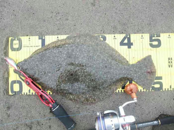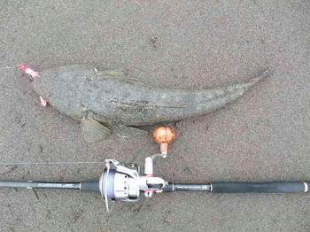 今年初のワームを付けてロッドを振ること約1時間、待望のバイト!獲物はマゴチでした。