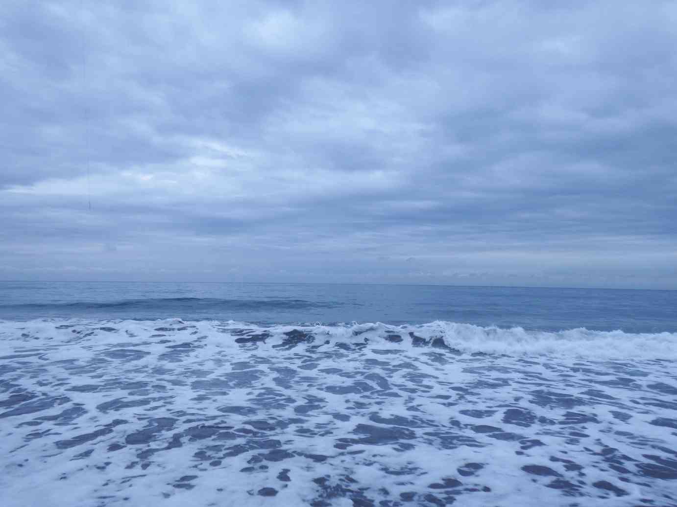 波打ち際に立つとムッとする空気、外気温は21℃で水温は25℃