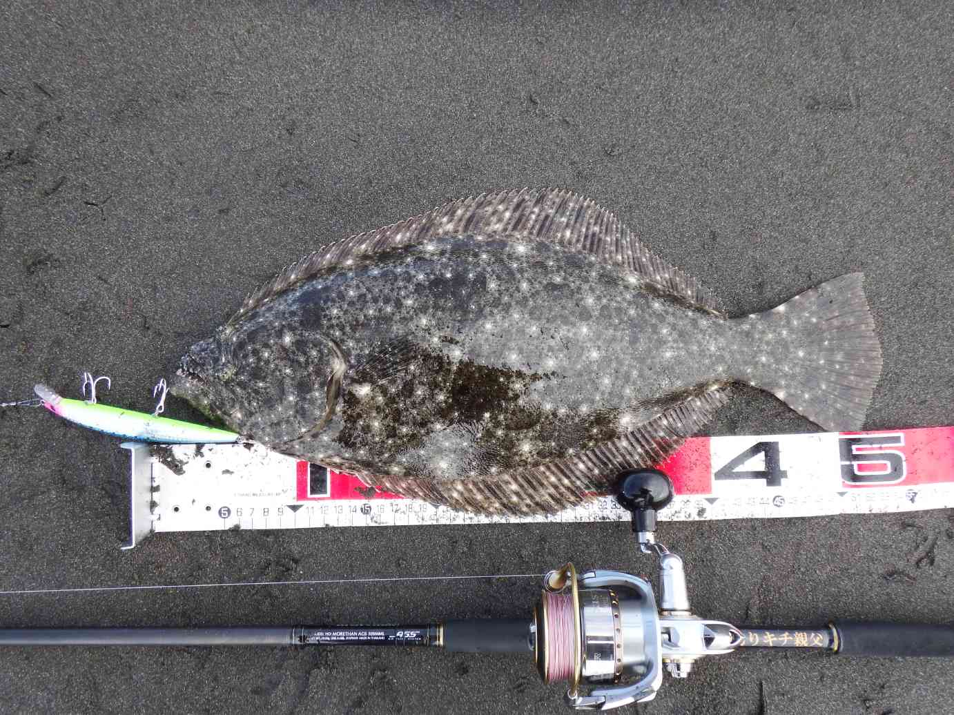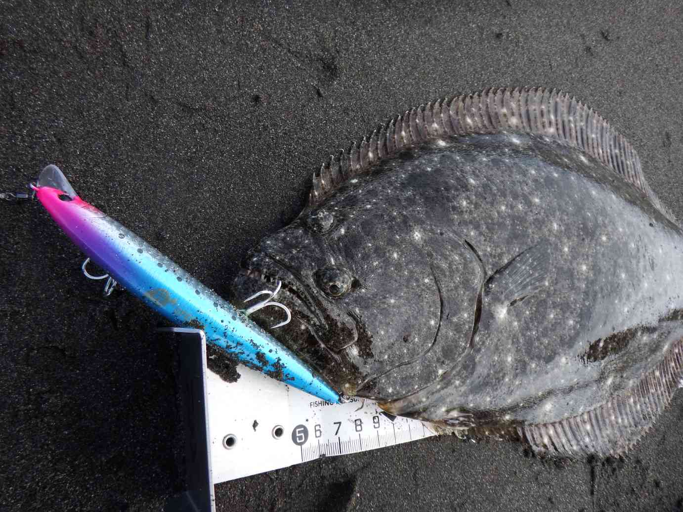 データ: 60cm、07:30ゲット、水温25.8℃、アスリート14SS(ヒラメのエサ プレミアム)