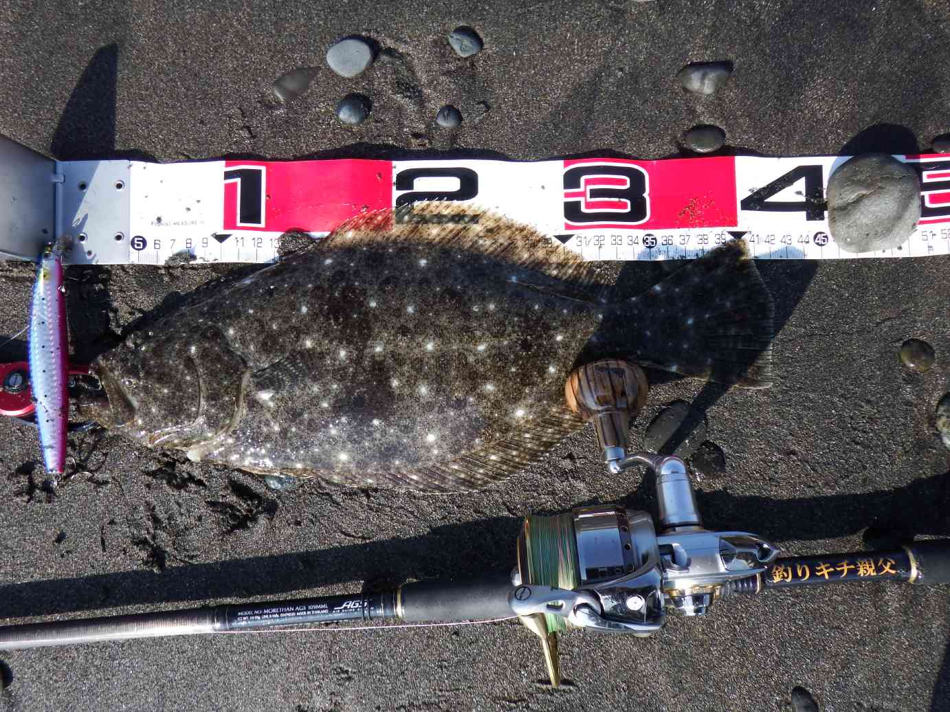 ヒラメの引きと横潮が重なりかなり重い、ズリ上げてみるとアレッ?て思うサイズでした。