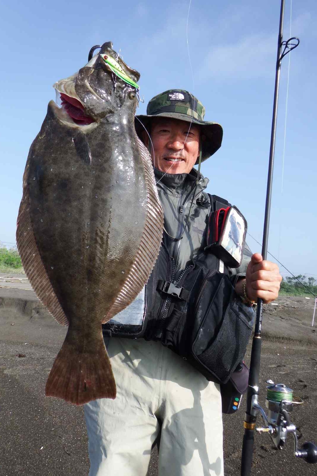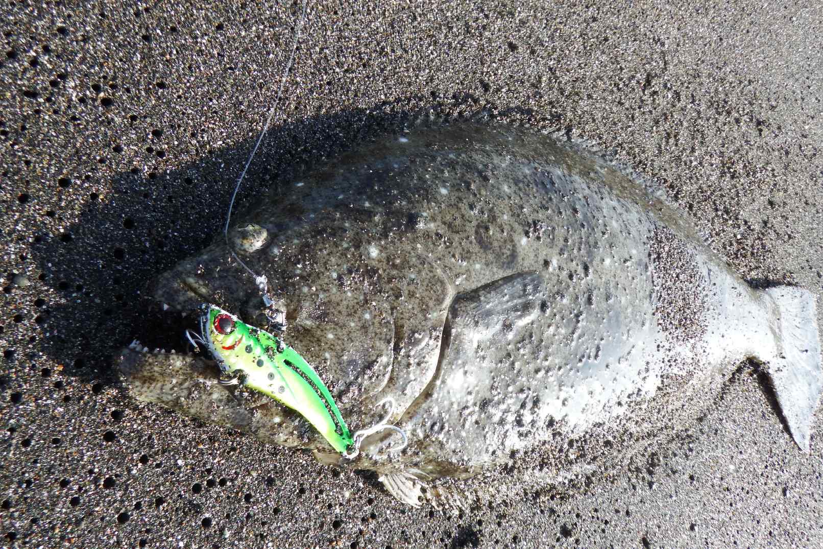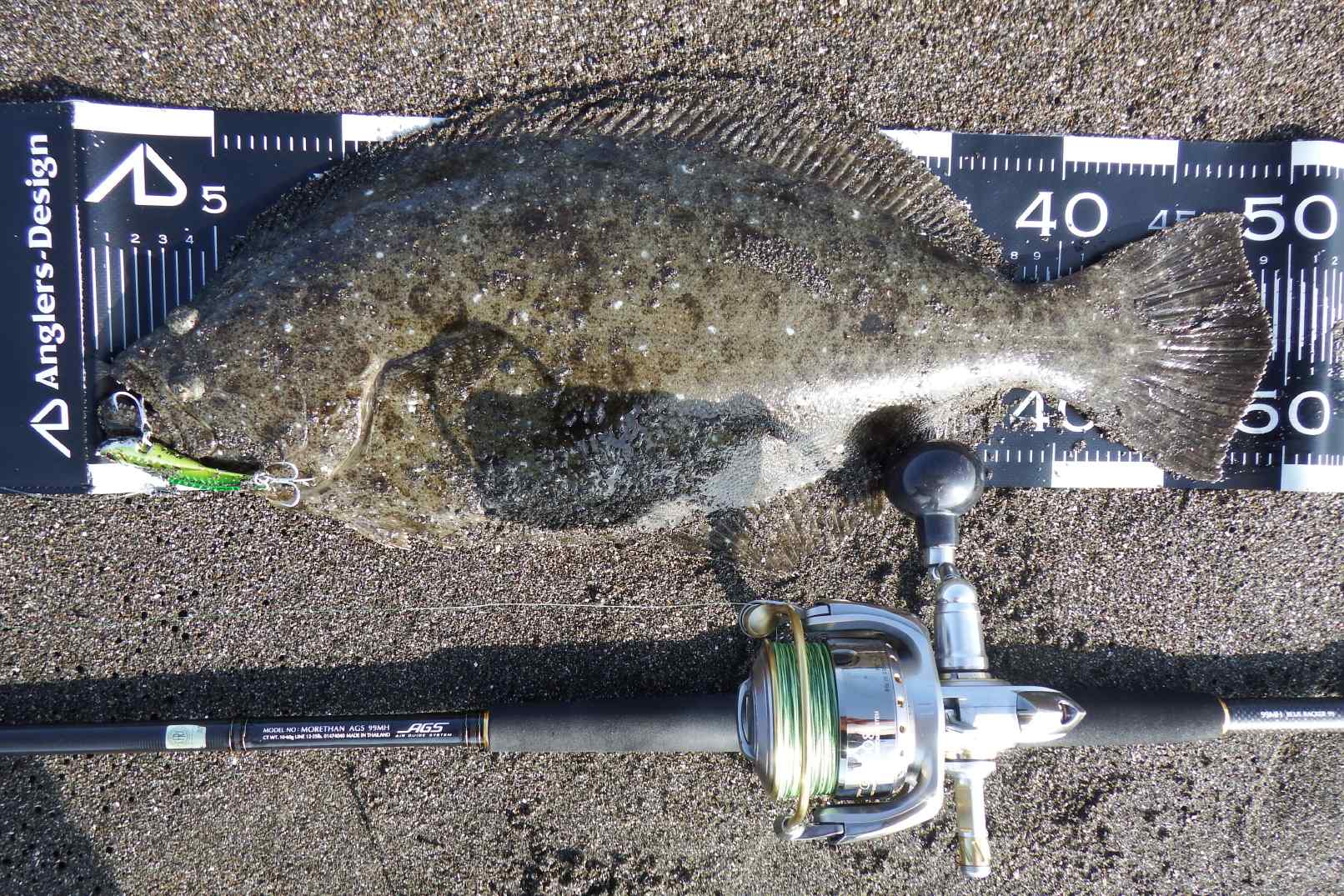データー:06:30ゲット、49cmのヒラメ、水温19.8℃、ジャクソン鉄PANVib、ゴールドグリーン26g