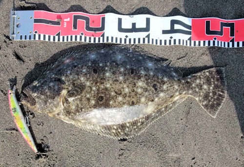 ファーストキャストでヒット、06:35に49cmのヒラメをゲット。