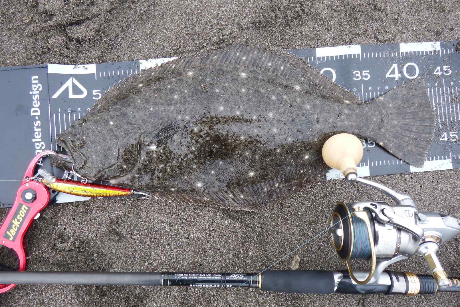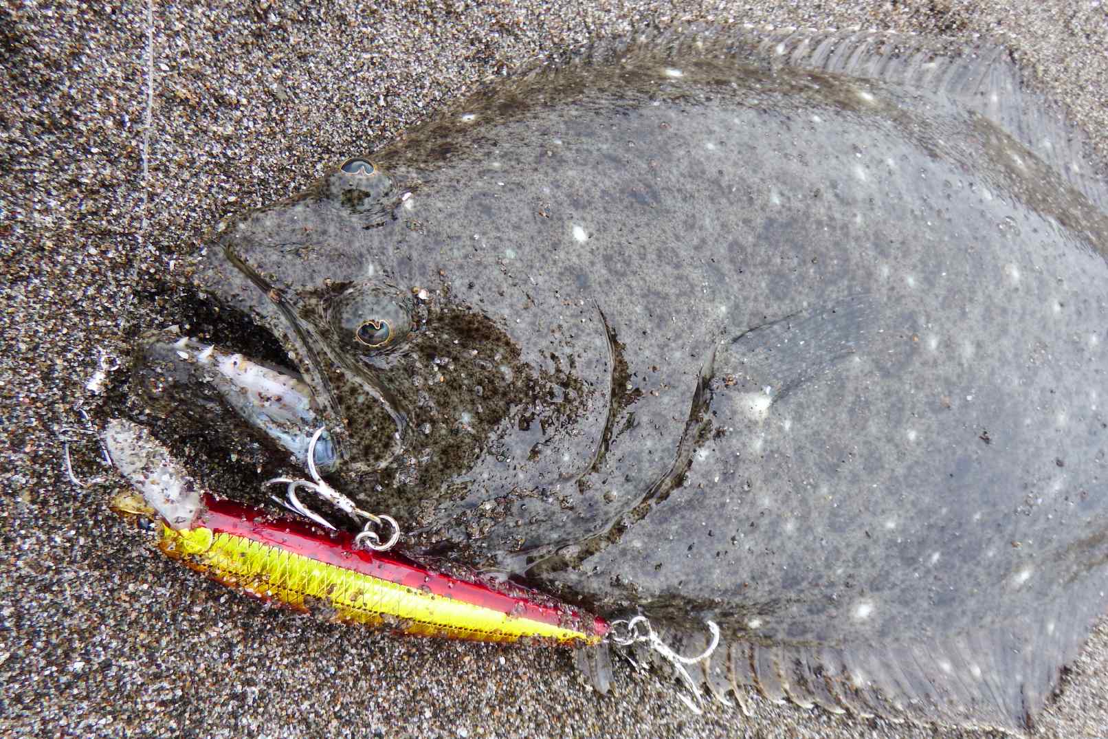 昨日に続き今日もダブルアカキンで、同サイズのヒラメが釣れました。