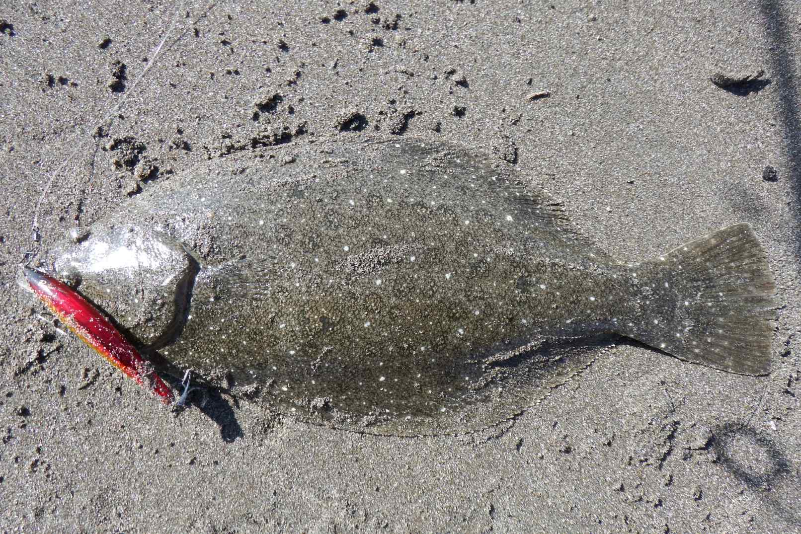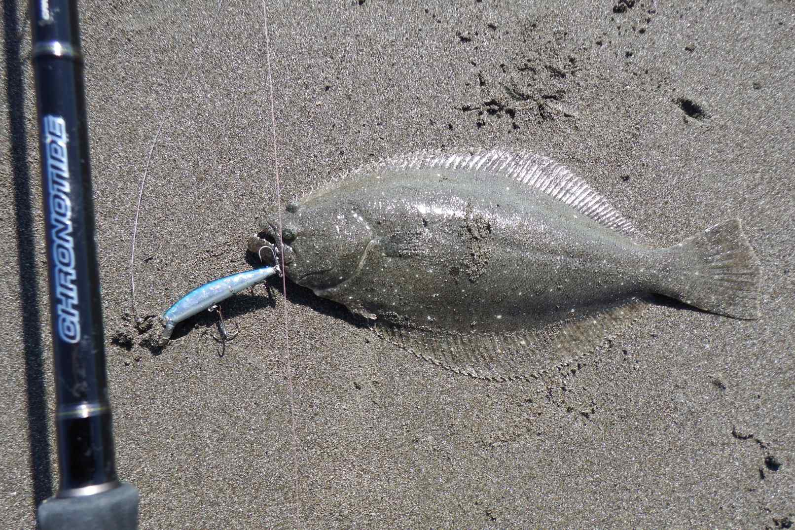 今度は間違いなくヒラメと確信する引き、慎重にハンドルを回し寄せ波と同時にズリ上げる。