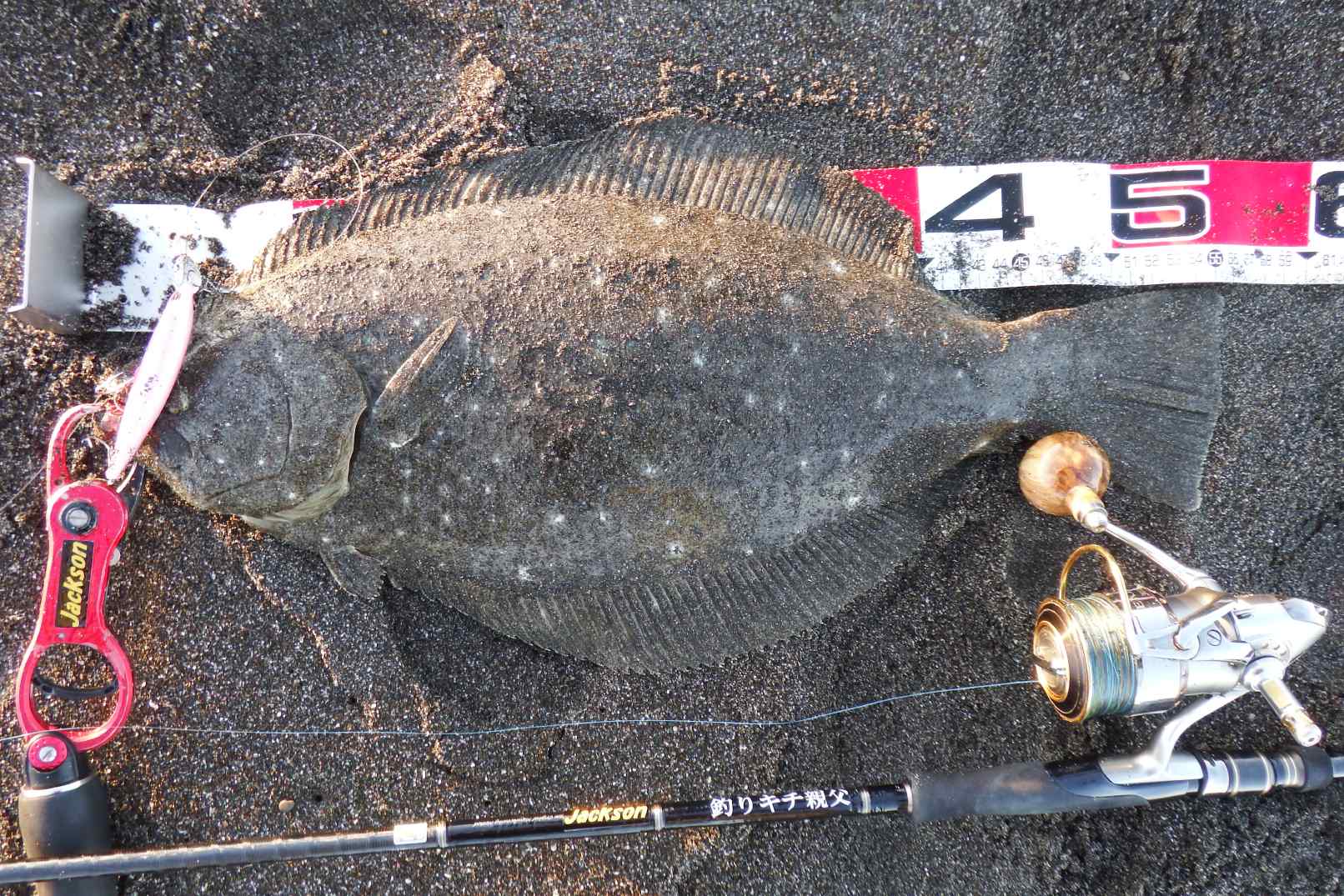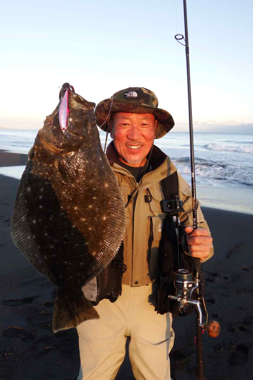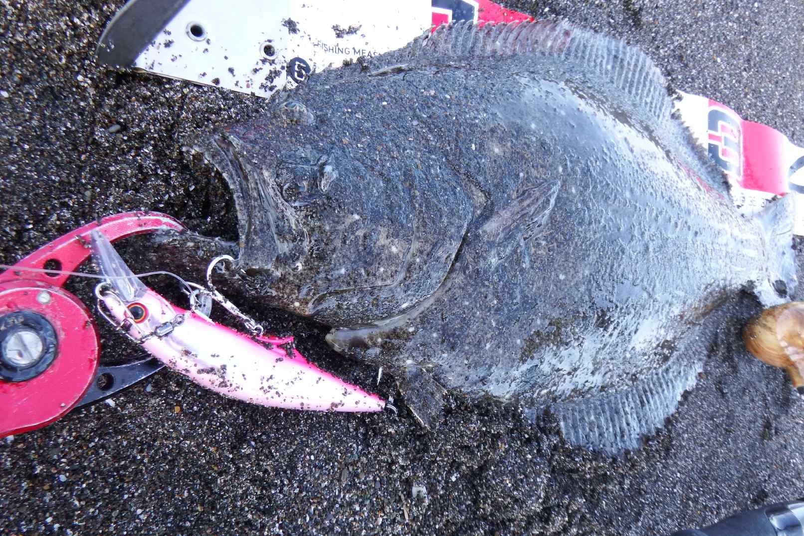 一瞬根掛りかと思い半信半疑でハンドルを回すと、間違い無くヒラメの引きに頬が緩む。