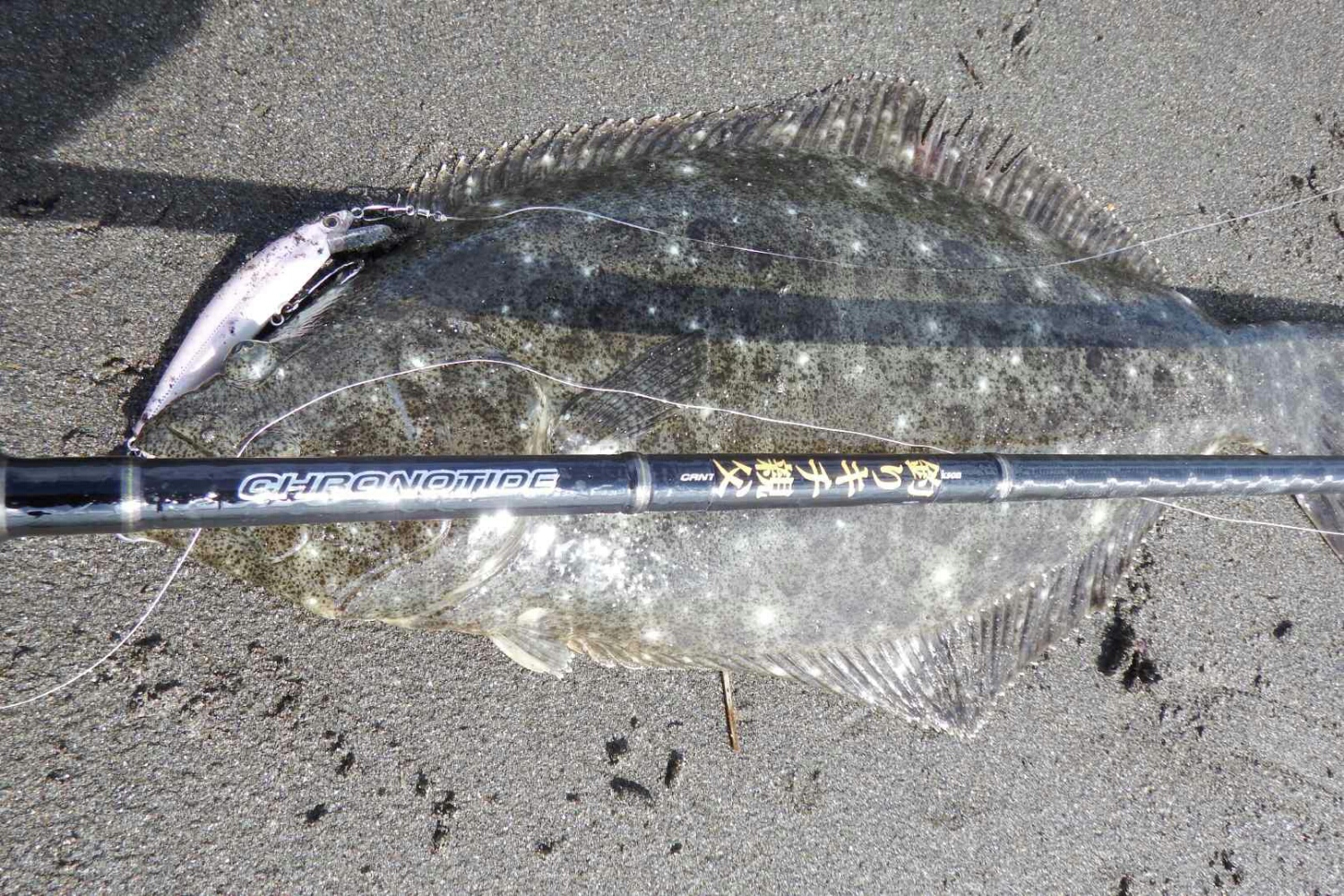シングルフックに替え、数投目、テップが入りハンドルを回す手が止まる「根掛りか」と思った瞬間、ロッド(CHRONOTIDE)から伝わる確かなヒラメの反応。