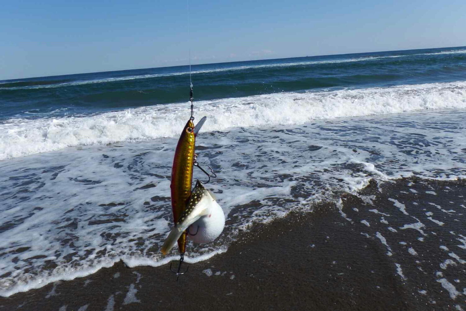 ルアーを取り替えながらキャストを繰り返していると、何か重さを感じ巻き上げると河豚!