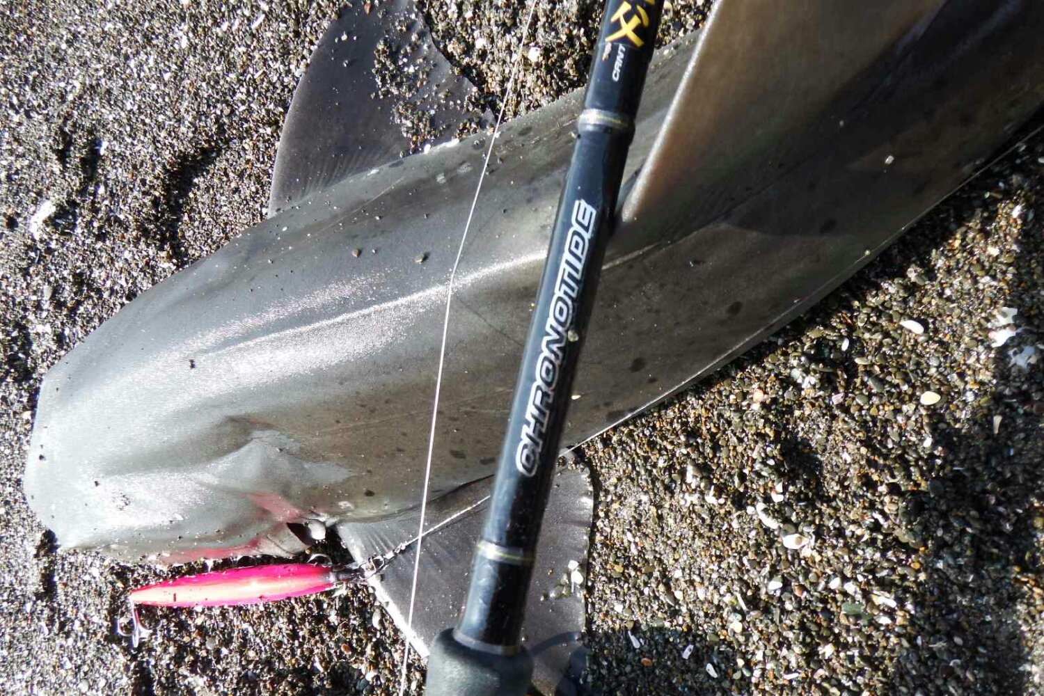 獲物は分からないまま前回のブログに書きましたが、CHRONOTIDE98Mがオオニベに耐えられるかどうか試すチャンスと見て、強引にポンピンぐして寄せようとするが止まらない。