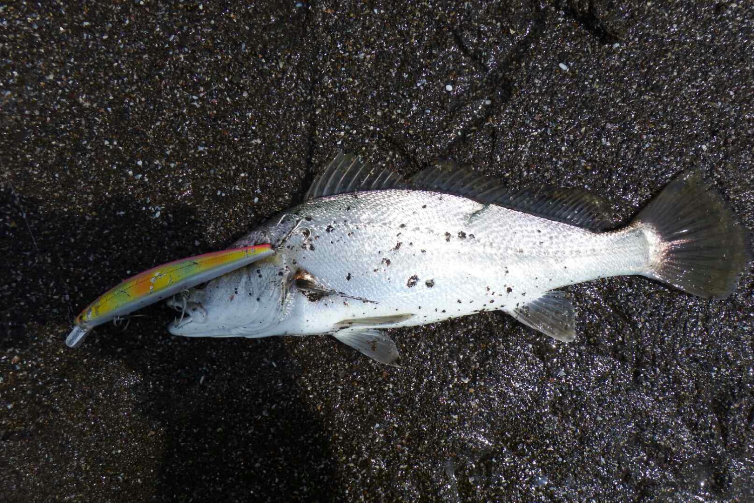 1時間ほど経過した頃、確かなバイトに合わせを入れハンドルを回すとそこそこの引き、ヒラメと思い慎重に寄せたがオオニベジュニアでした。