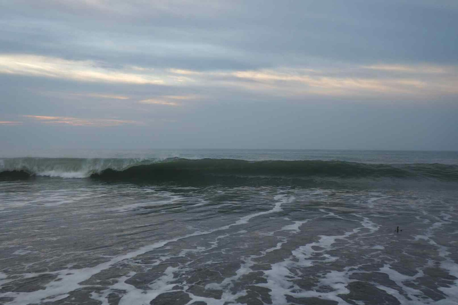 横に流れている川は泥濁りで増水、準備を済ませ日の出時刻にサーフに下りるが、当然同業者は居ない。