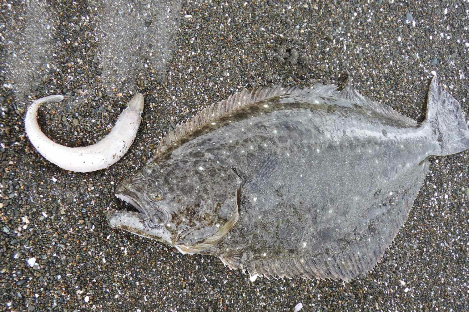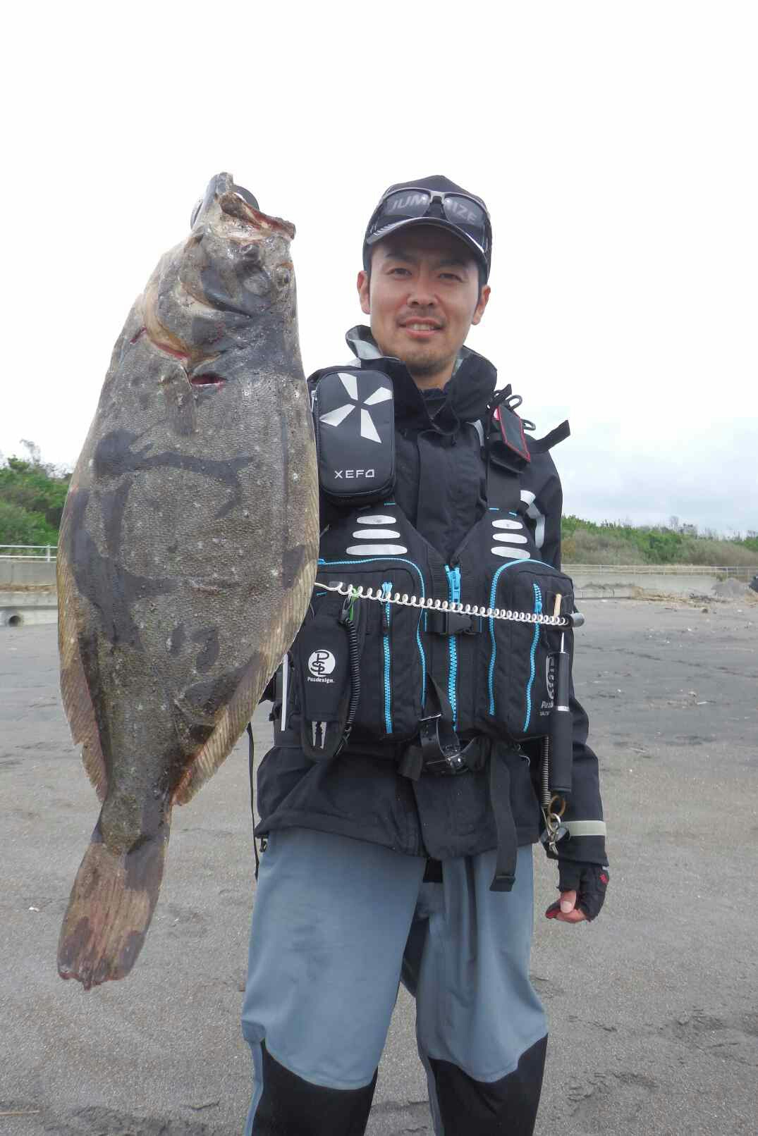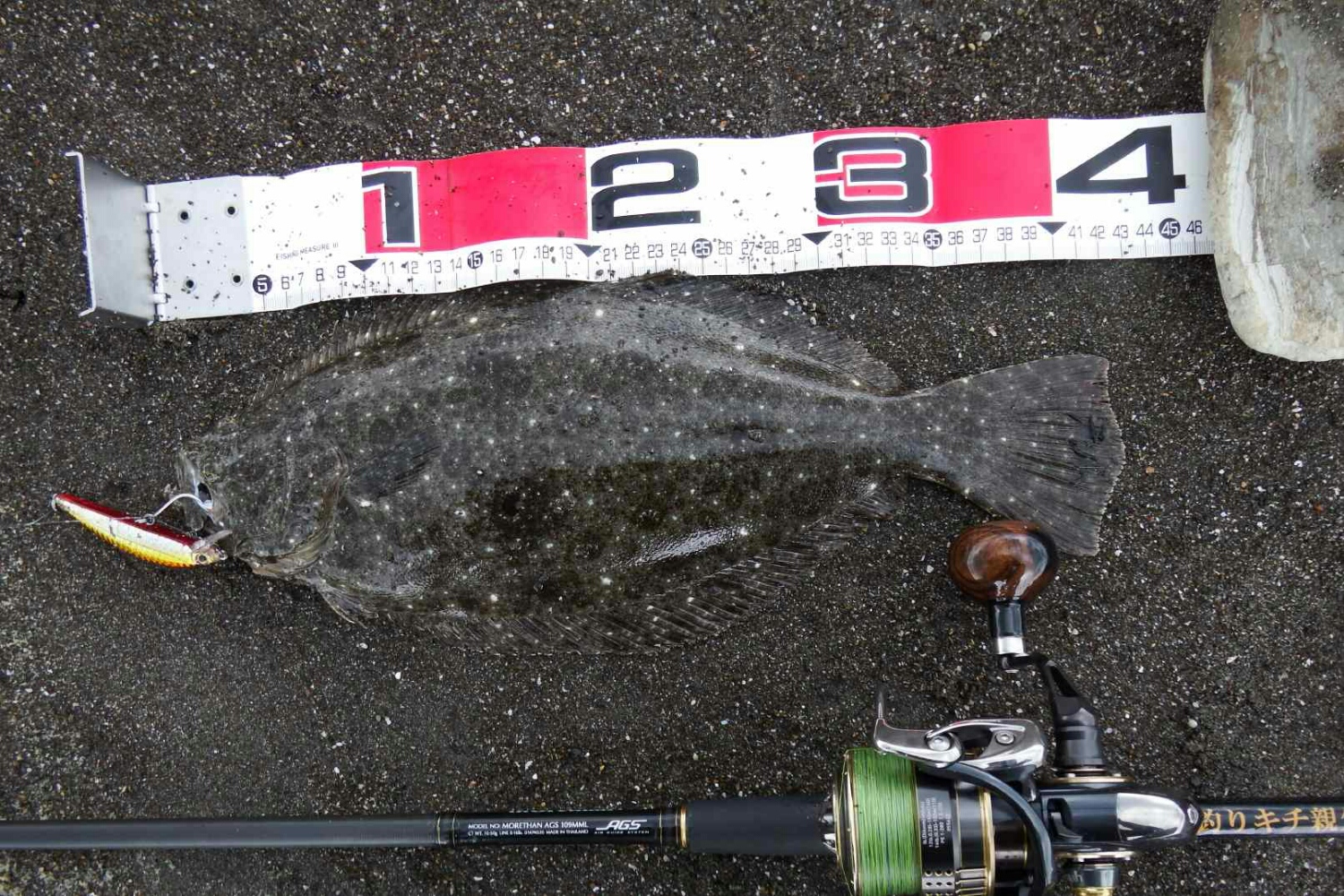 シングルフックなので念のため追い合わせを入れ慎重にハンドルを回すと、速い潮流の影響でかなりの重量感と抵抗感「シーバスか」と思いながらも強引に巻かず、潮流に逆らわず流と共に歩き距離を縮め寄せ波に合わせてズリ上げ、白波が引いた後、予想に反して現れたのはヒラメでした。