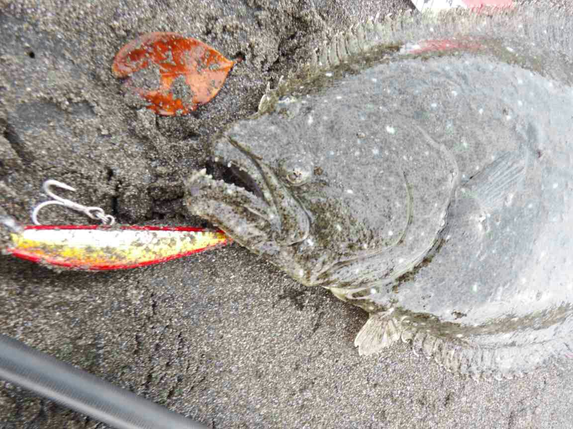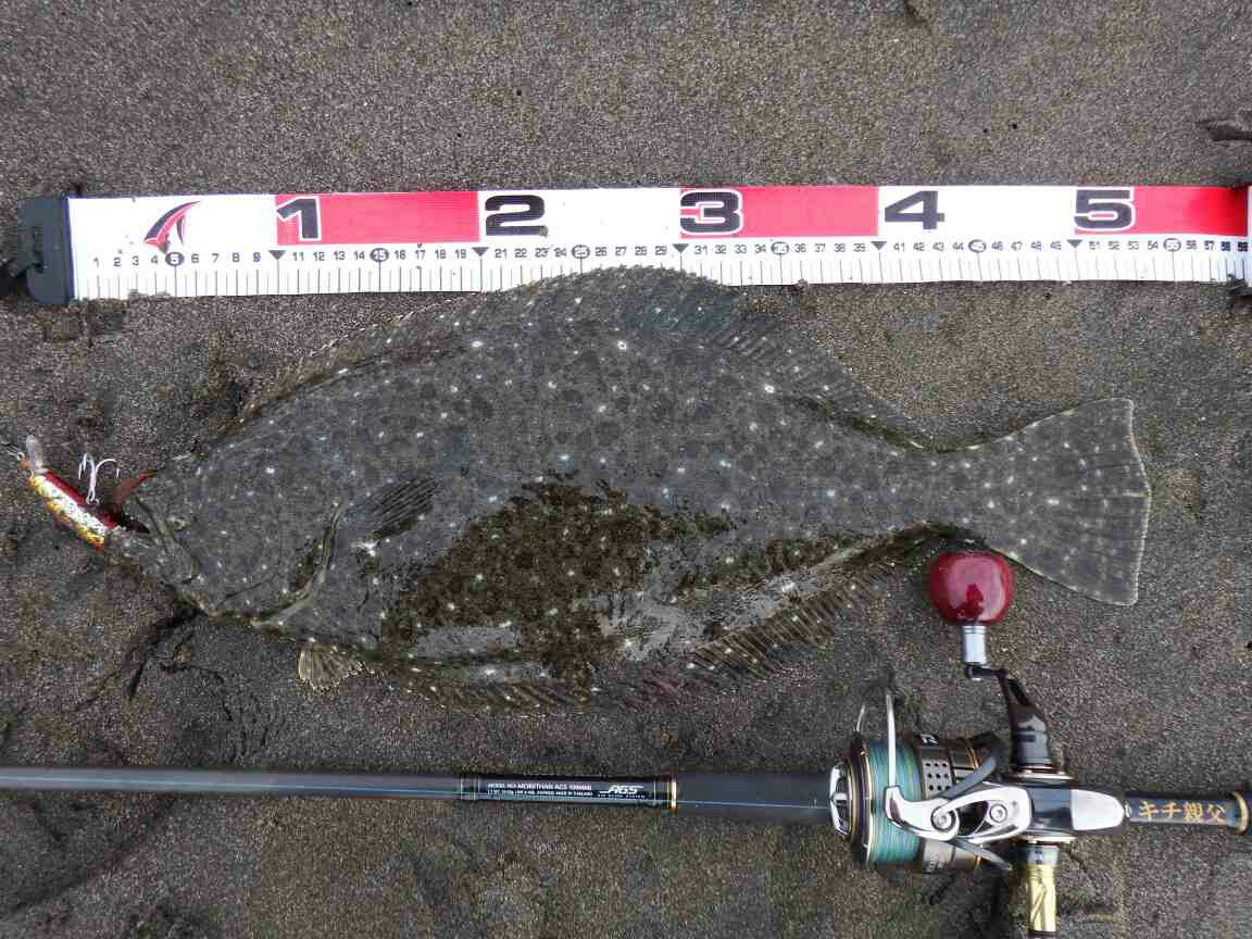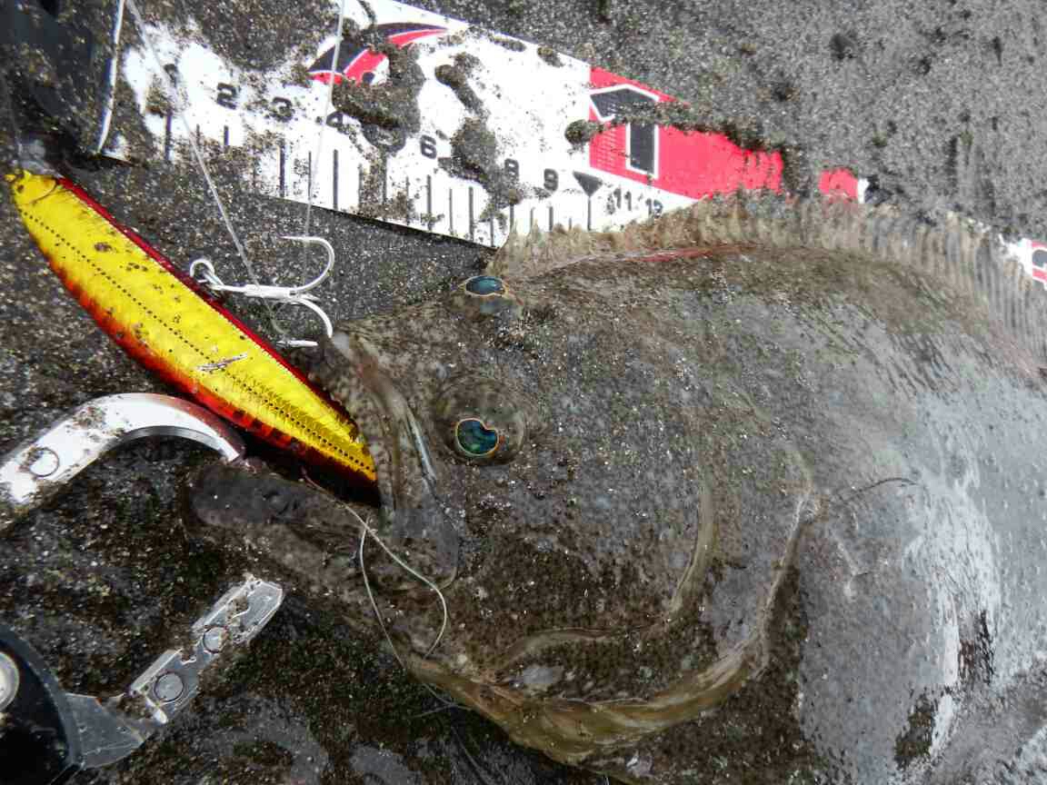 データー:12:30ゲット、ヒラメ体長47cm、ジャクソン ピンテールチューン27 ダブルアカキン