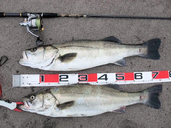 シーバス2匹をストリンガーに掛け、ぶら下げて歩くには重く(約8kg)