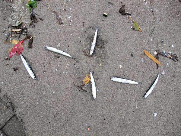海岸では地元の人がバケツを持って鰯拾いに勤しんでいる、