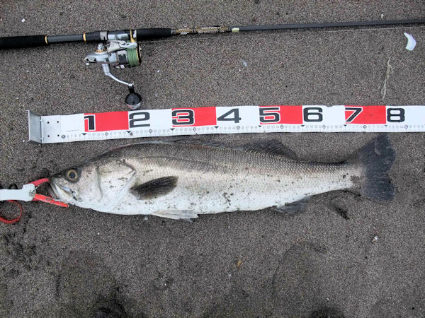 16:40、82cm(4.5kg)のシーバスをゲット! サーフのシーバス、記録更新。