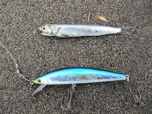 次がメッキ、又ワカシ、更にラン&ガンしているとカタクチイワシが打ち上げられている。