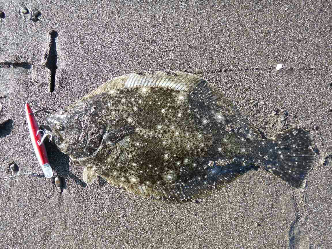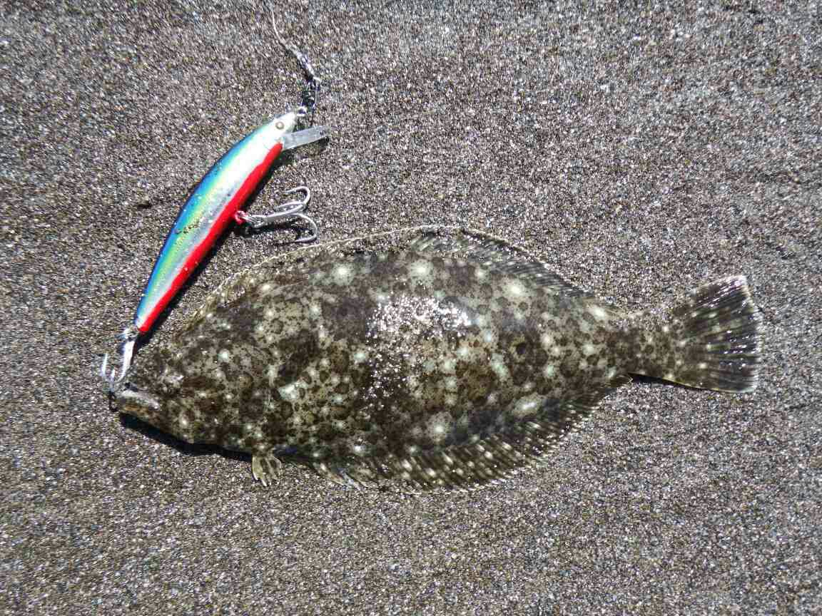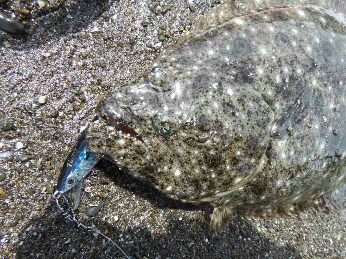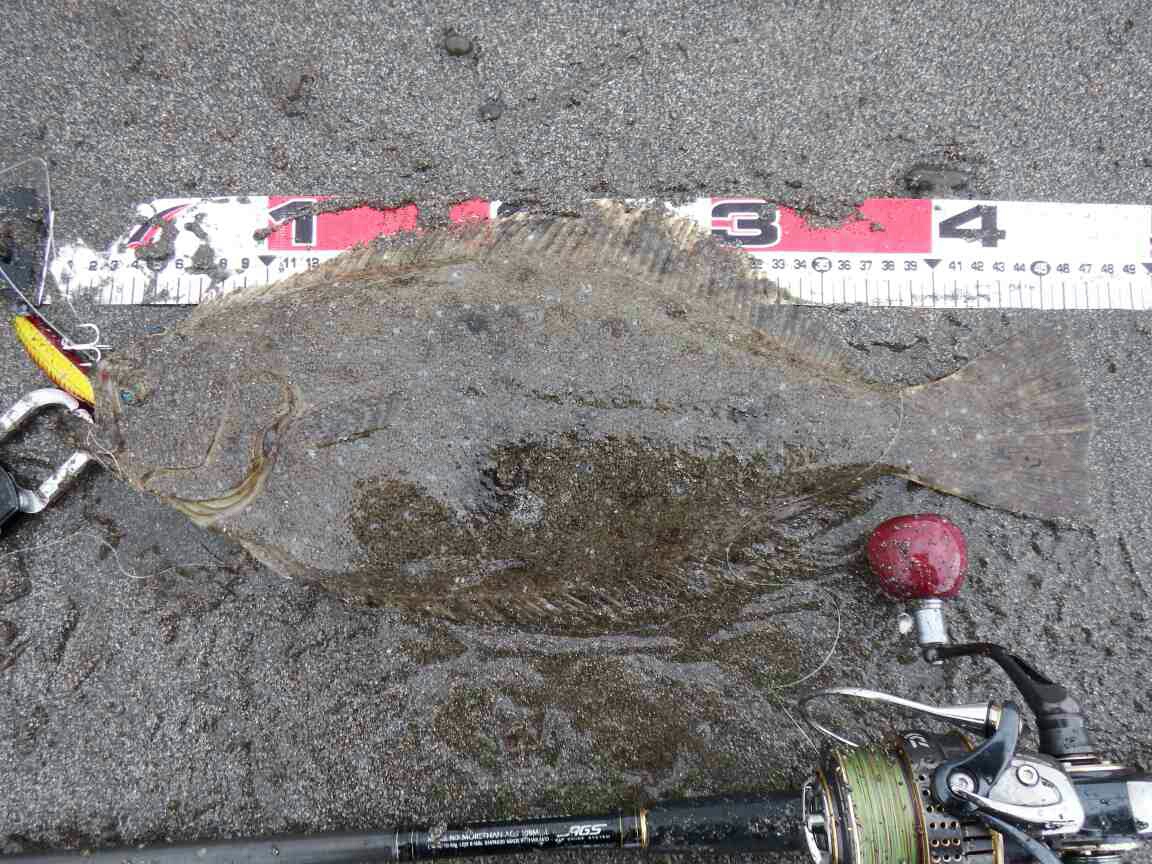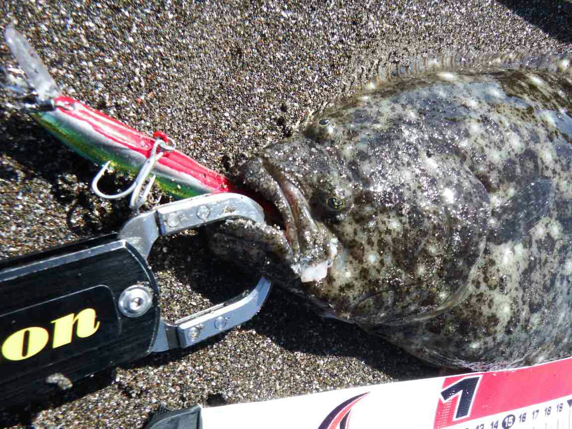 データー:14:00ゲット、ヒラメ体長45cm、ジャクソン ピンテールチューン27 キビナゴ