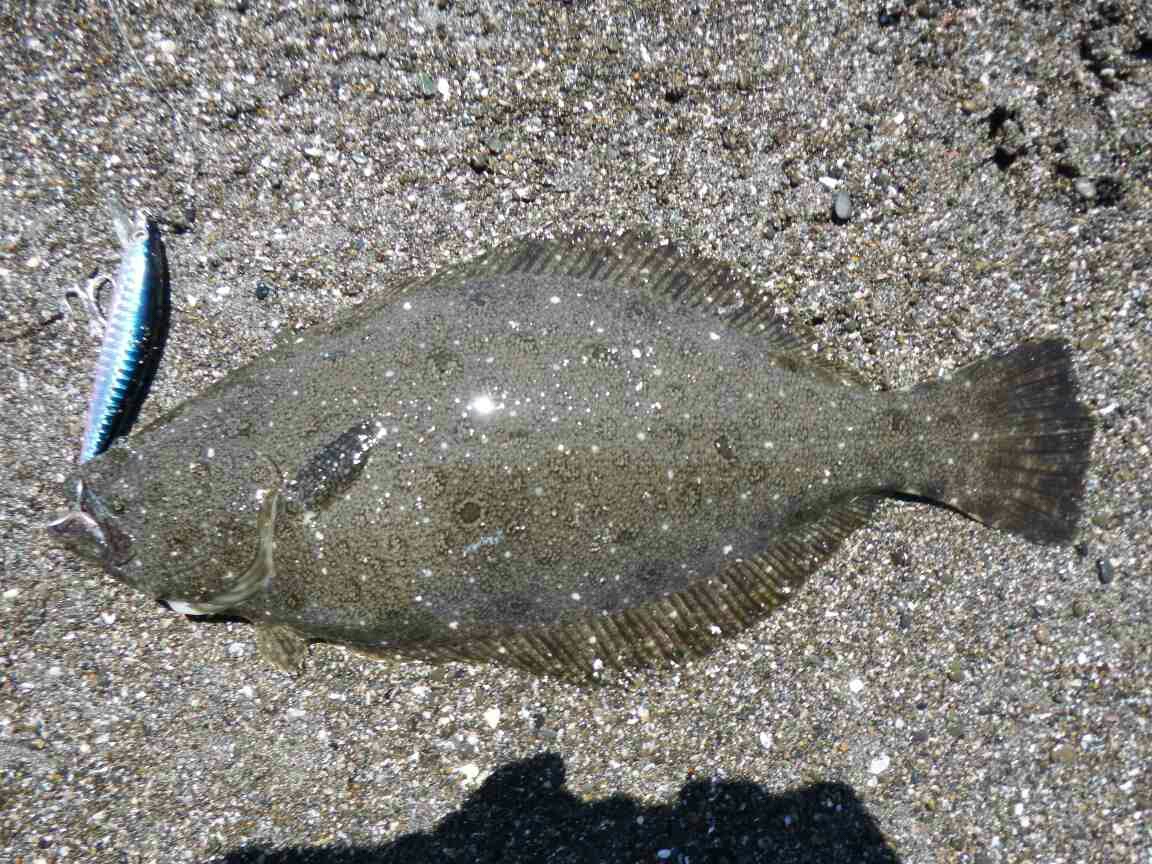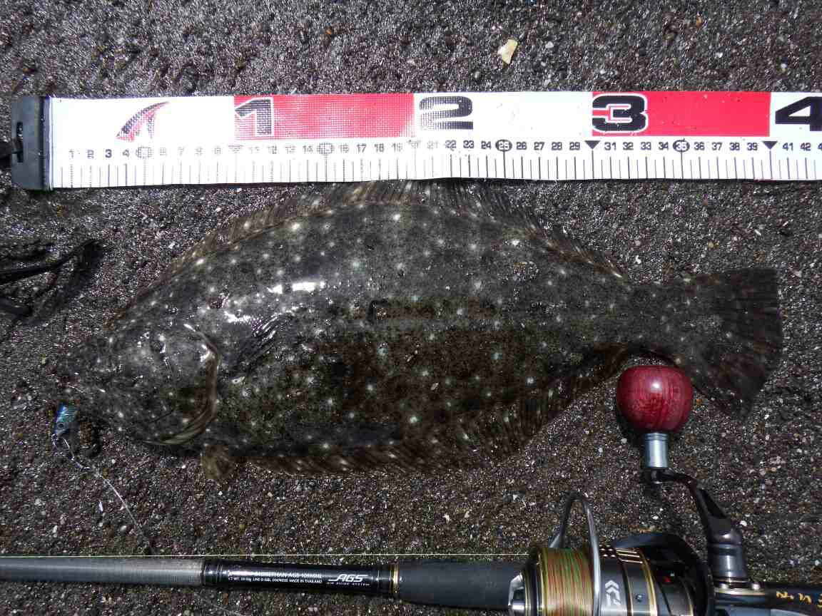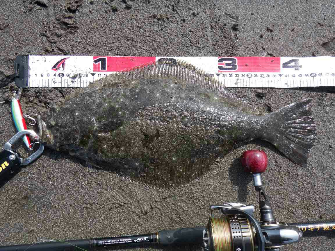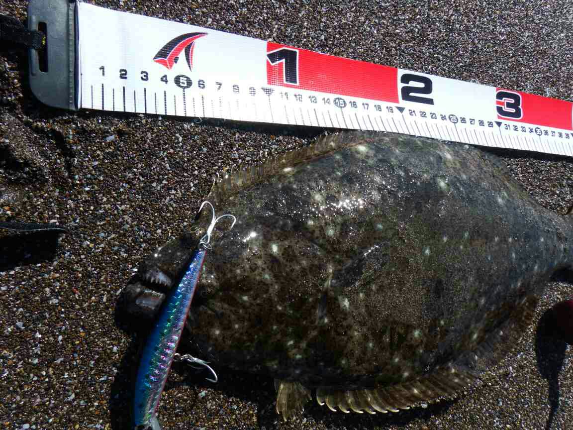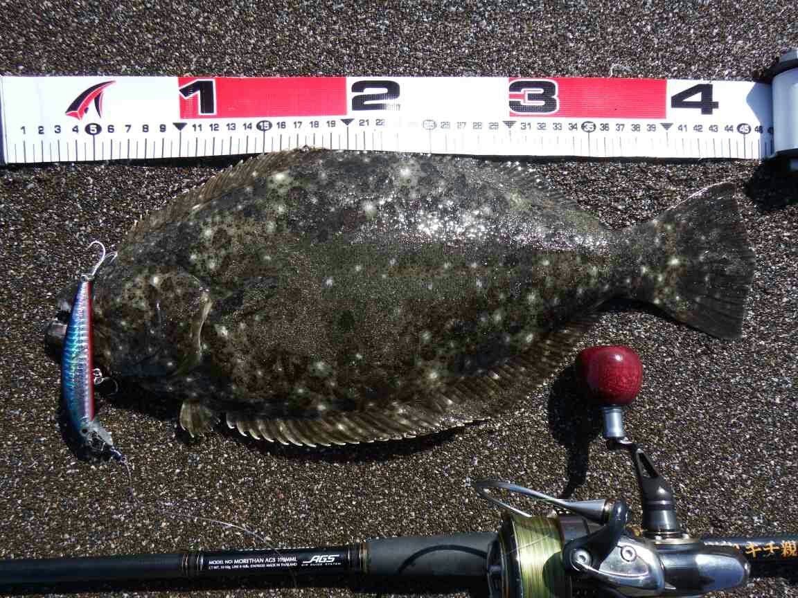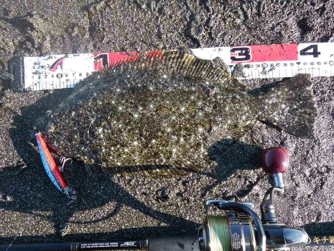 データー:13:20ゲット、ヒラメ体長41cm、ジャクソン ピンテールチューン27 キビナゴ