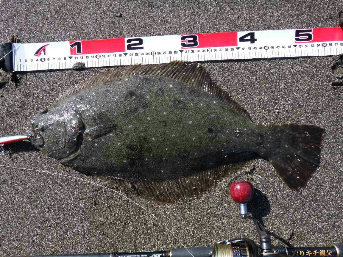 データー:15:30ゲット、ヒラメ体長55cm、ジャクソン ピンテールチューン27 アカハライワシ