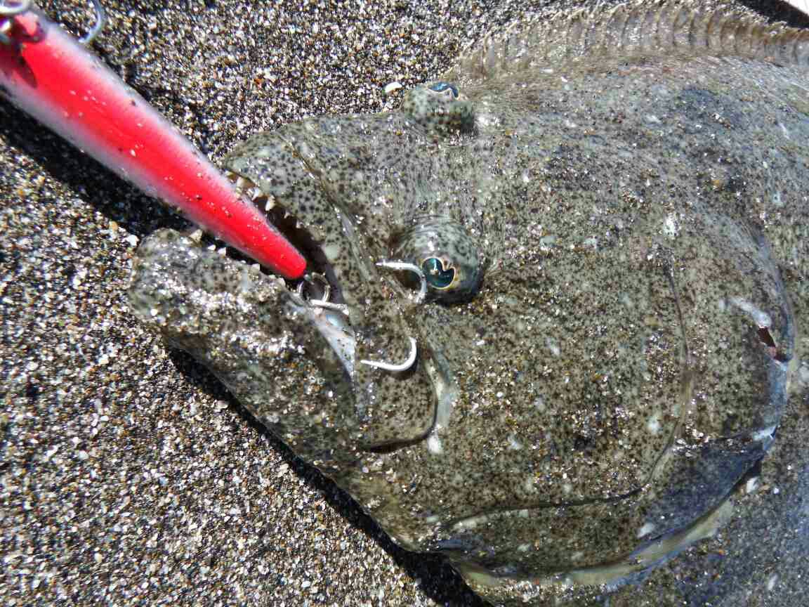 データー:15:00ゲット、ヒラメ体長45cm、ジャクソン ピンテールチューン27 アカハライワシ