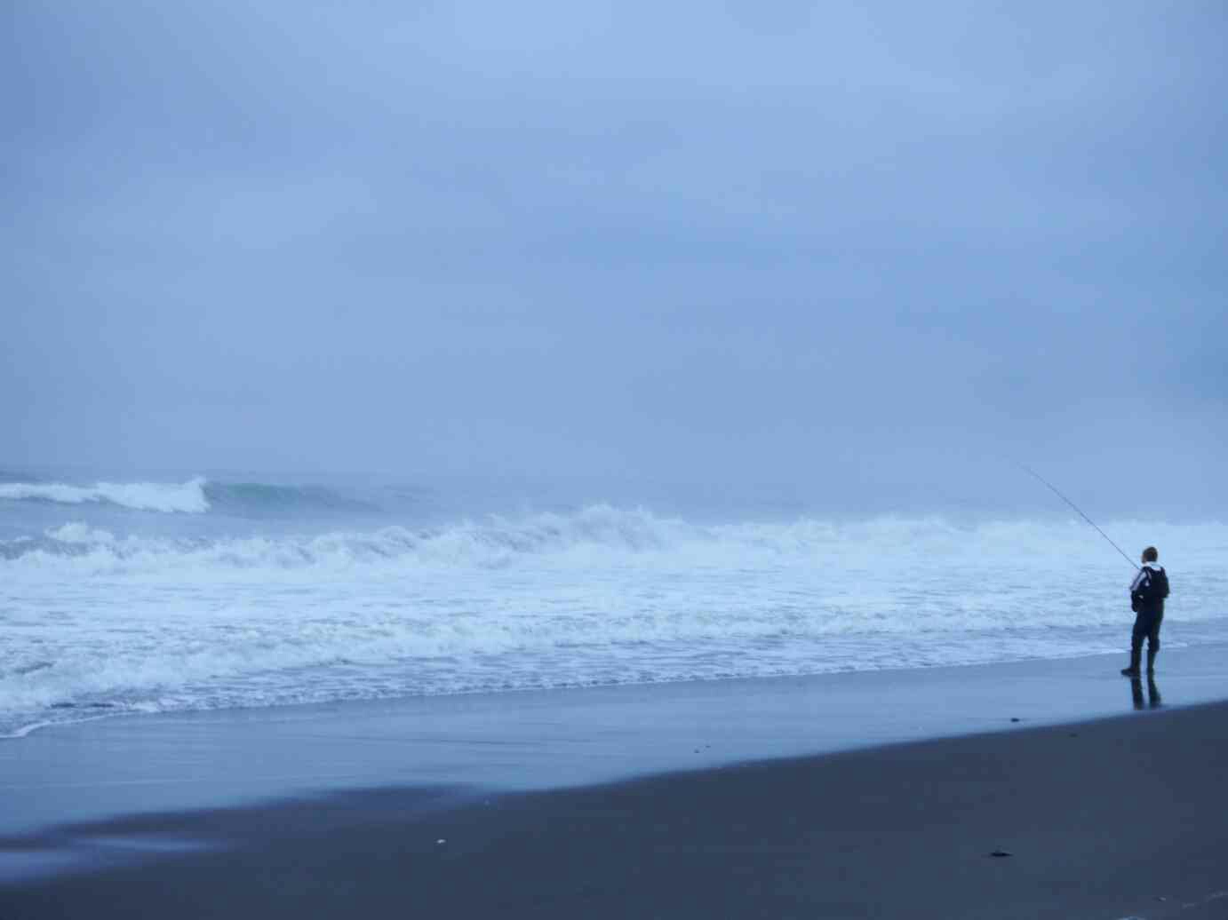 前日の打ち合わせで、吉田さんのお勧めポイント(B)から始める事になったが、雨が強くなり始めたので「中止」を要求したが、「やりましょう」という言葉に押され、準備済ませサーフに下りキャスト開始。